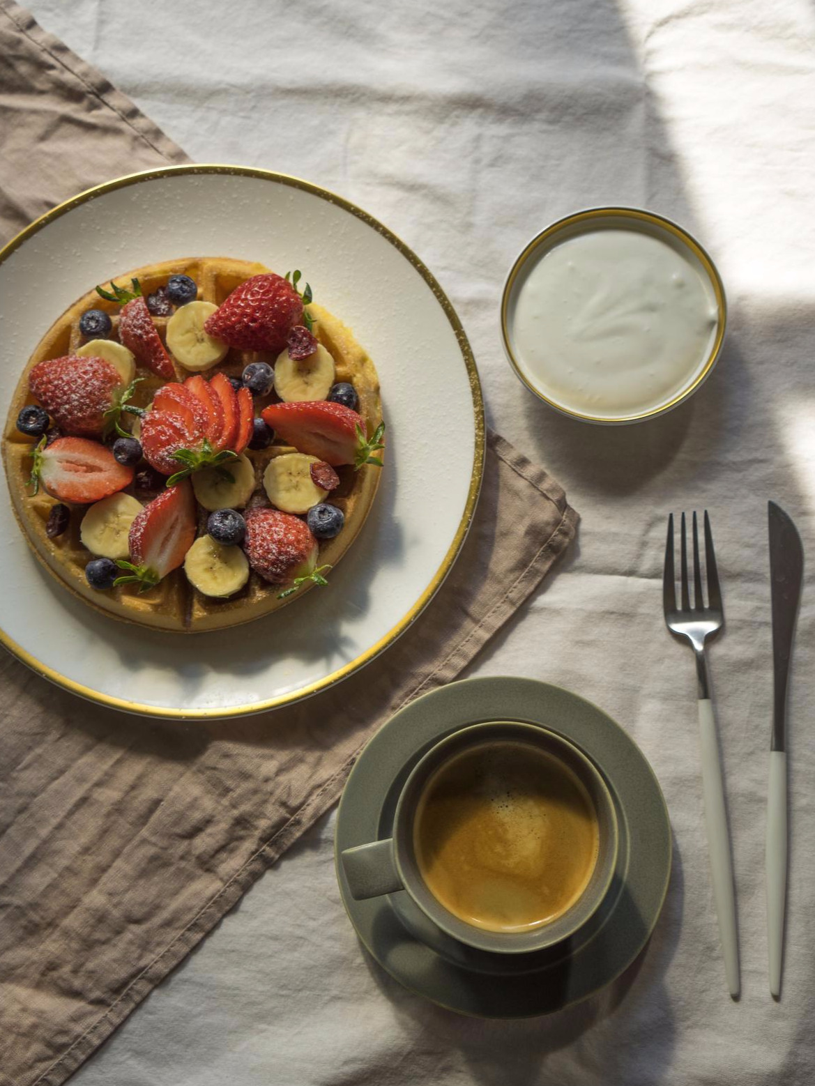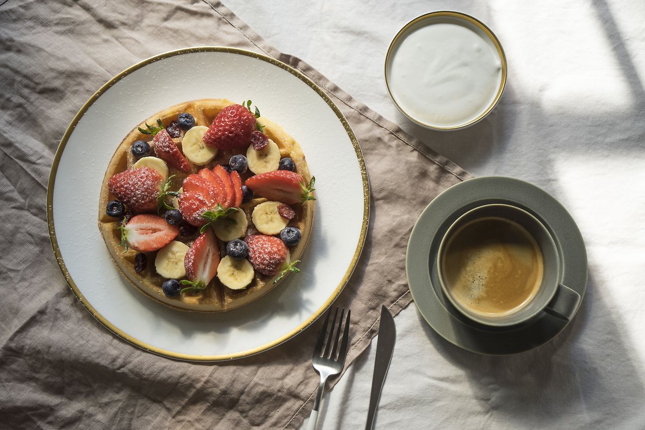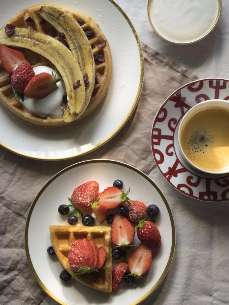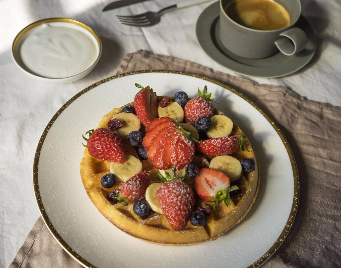 아, 이 와플은 굳이 따지자면, 벨기에식 와플입니다.와플 빵 자체가 달지 않고 신선한 과일과 크림을 곁들여 먹는 스타일이 벨기에식. 미국식은 예상하는대로 설탕을 많이 넣어 달게 먹는 스타일. 그래도 조금 단 맛이 있어야 되니 메이플 시럽을 토핑으로 뿌려주었어요. 생크림에 설탕을 넣어 휘핑을 해주어도 좋습니다.