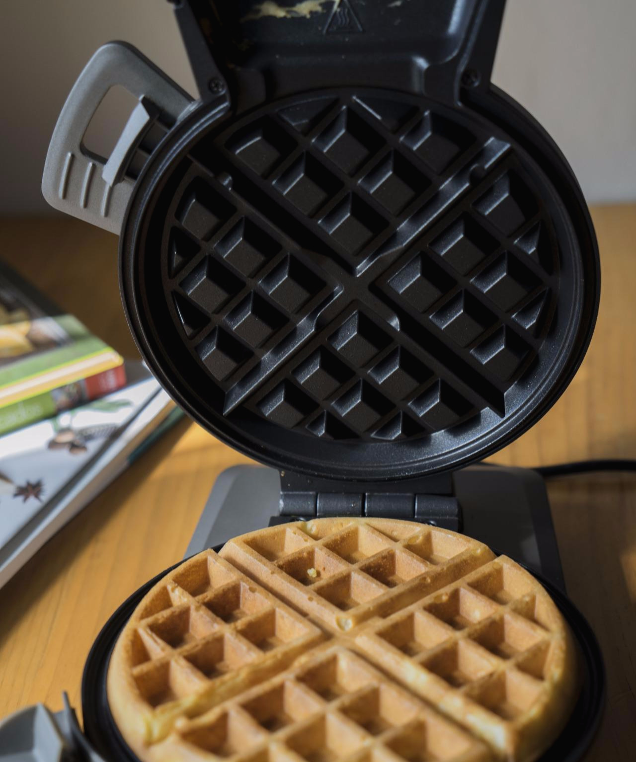 김이 모락모락 올라오고, 다시 삐~ 소리가 납니다. 와플이 완성이 되었다고 알려주네요. 뚜껑을 열어주면, 이렇게 와플이 잘 완성이 되었습니다. 잘 떨어지고, 모양도 잘 나와서인지 약간의 쾌감이 있네요.