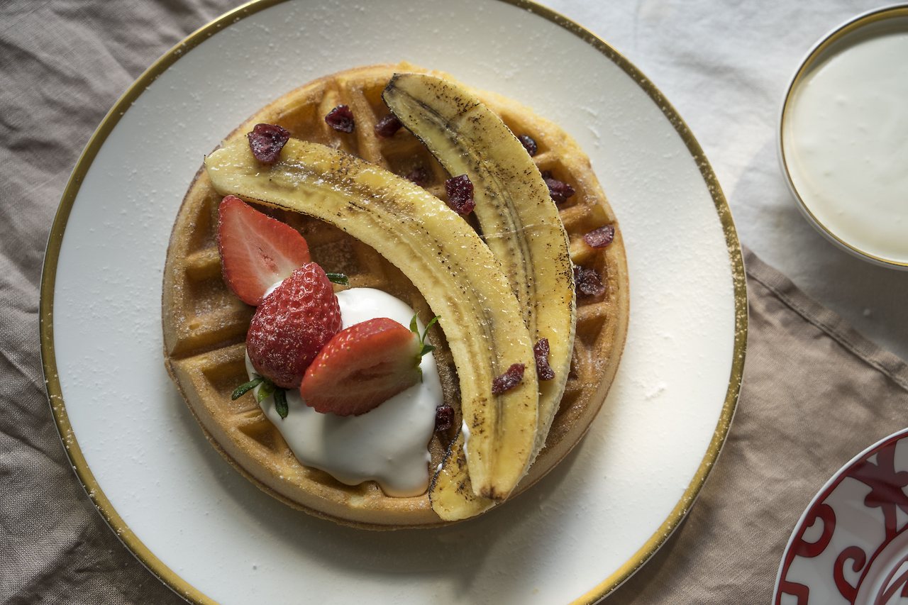 이번 플레이팅은 토치로 구운 바나나를 올린 와플입니다. 통으로 올라가니 먹음직스러워 보이지요. 딸기의 색감을 위해 크림을 살짝 깔아주었습니다. 민트잎이 없어서 초록 꼭지를 떼지 않고 초록초록한 느낌을 주었는데, 이건 거의 직업병인 것 같긴합니다. 먹을 때 조금 불편하다는 것...