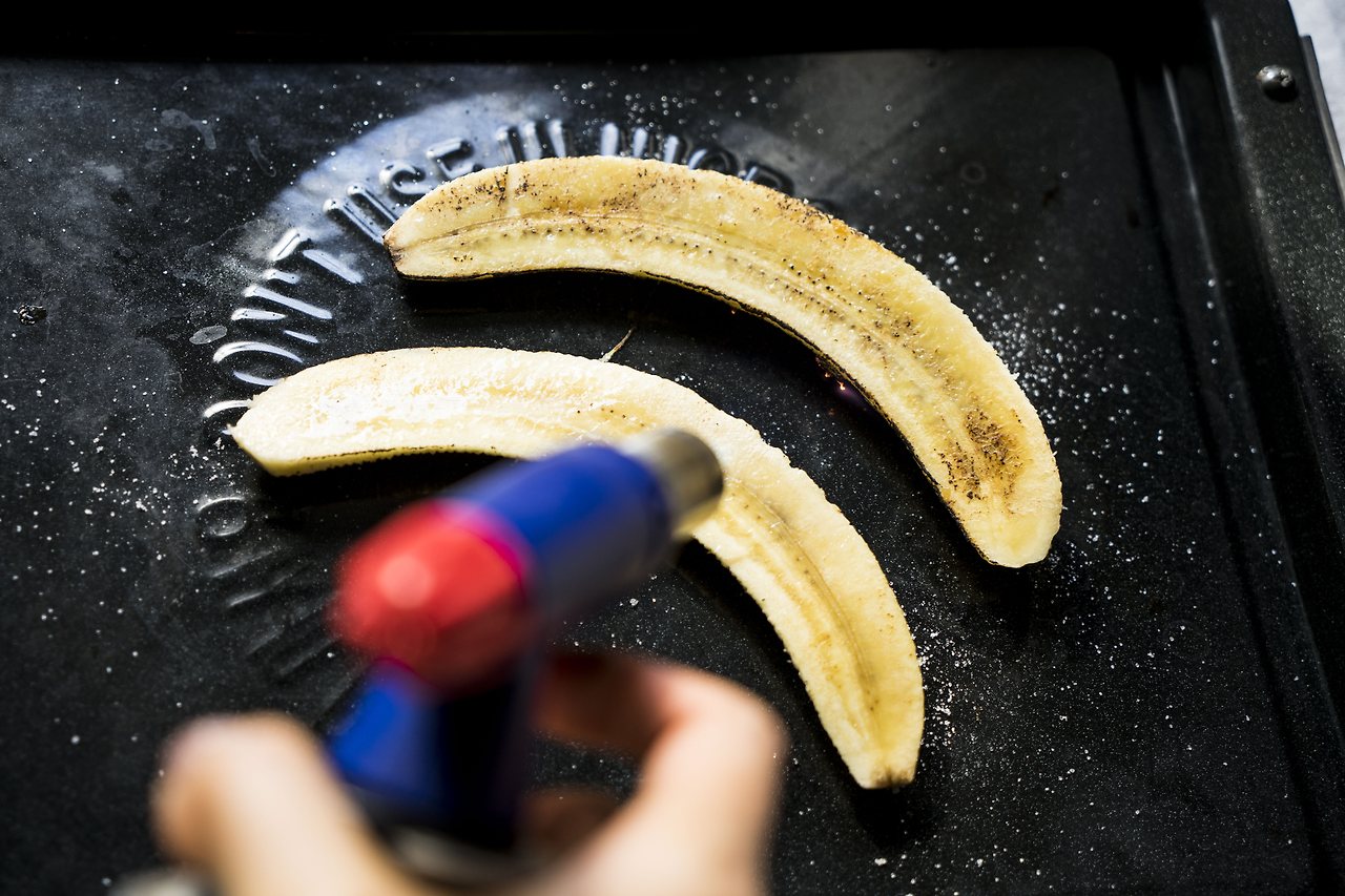 바나나 위에 설탕을 충분히 뿌리고, 토치로 그을려주세요. 바나나로 디저트를 만들 때 자주 이렇게 하곤 하는데, 맛도 비주얼도 좋아집니다. 물론 토치를 집에 잘 가지고 있지 않기 때문에 생략 가능하고요.