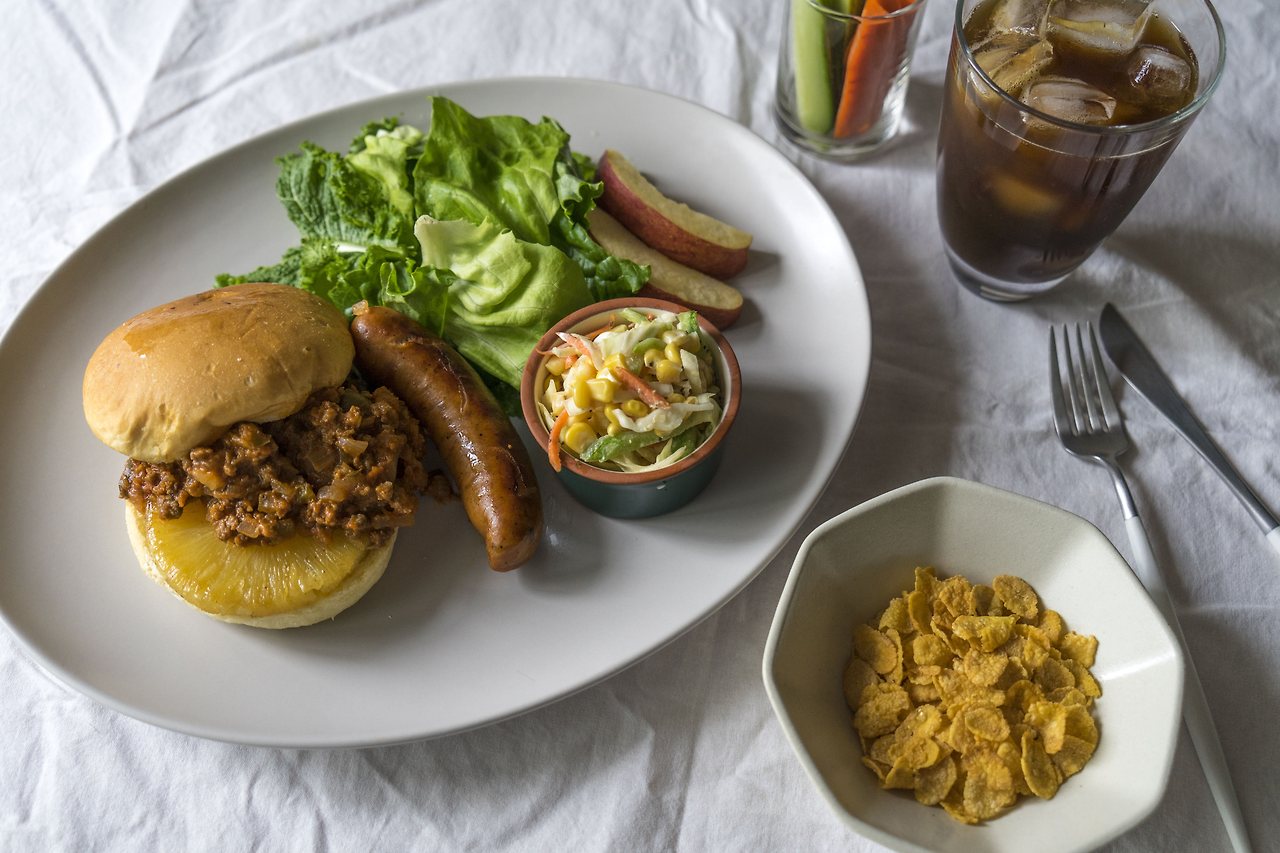 토요일에는 바깥에서 사먹는 식사처럼 준비를 하고 싶습니다. 토요일이니까요. 버거 번에 파인애플 한 조각과 슬로피조를 얹고나서 무심한 듯 소세지를 툭. 결혼하고 처음 소세지를 제 돈 주고 사게되었는데, 슬로피조 핫도그 영상을 만들기 위해서는 소시지가 빠질 수 없기 때문이지요. 아주 비싼 소세지를 구매했습니다. 소세지는 대부분 비싼 것이 좋은 것과 동일하니까요. 사이드로는 고맙게도 양배추 남은 것으로 만들어 놓았던 코울슬로가 남아있어서 조금 담았습니다. 일단 배를 달래고 시작하기 위해 콘푸러스트도 준비했어요. 오늘은 조금 무거운 메뉴라 살이 잘 찌는 남편용으로 채소 스틱도 곁들여줍니다. 이것저것 놓다보니 푸짐하네요. 아이스 아메리카노 한 잔도 준비가 되었으니 이제 밥먹자고 말해볼까요.