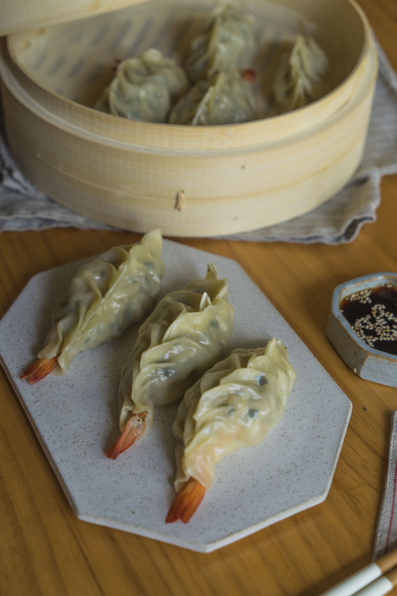 저는 영상에서 극적으로 새우를 보여드리기 위해 새우를 통째로 사용하고 끝쪽에 꼬리를 보이게 빚었지만, 사실 새우살을 다져서 다른 소들과 함께 버무려 넣으셔도 똑같이 맛있는 새우만두가 됩니다. 저희 엄마의 경우, 다양한 소들과 새우살이 어우러지는 맛은 새우를 다져서 넣었을 때가 더욱 좋은 것 같다고 하신 걸 보면 두 가지 방법 모두 나쁘지 않다는 것. 아참, 사진의 접시와 종지는 제가 만든 그릇입니다. 뒷면에는 인생집밥이라고 새겼습니다. 처음으로 만든 접시에 첫 음식은 정성이 담긴 새우만두가 좋을 것 같아 담아보았는데, 만두도 그릇도 직접 만들어서 그런지 애착이 가네요.
