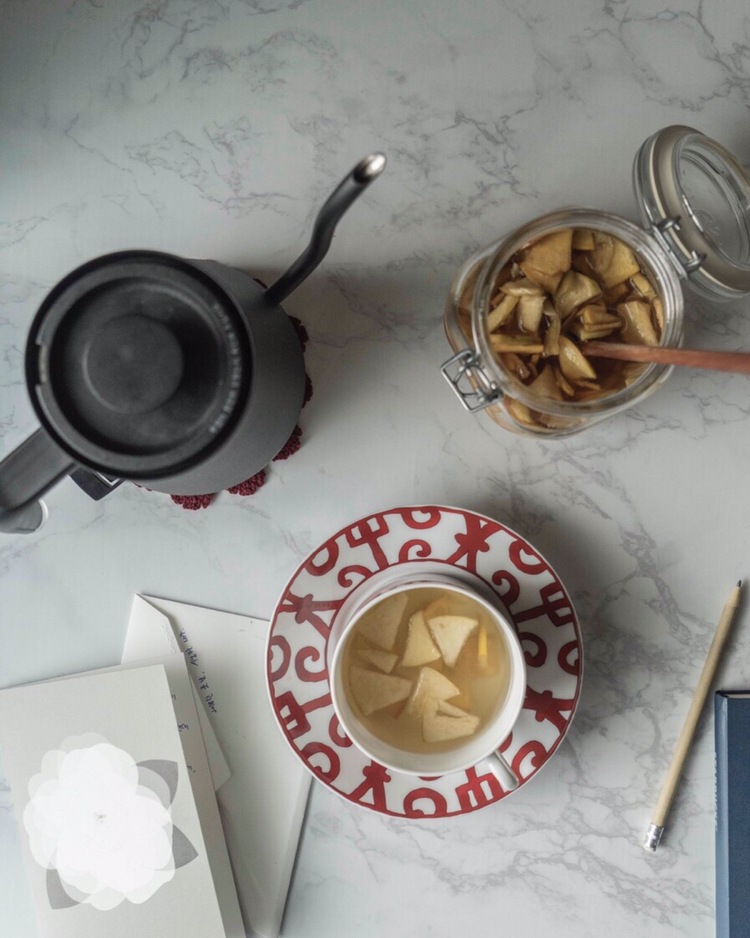 숙성되는 시간이 있어 딱 새해에 먹으면 좋겠다 하고 담갔던 모과사과청을 새 해 첫날 열었어요. 차분한 티타임으로요.