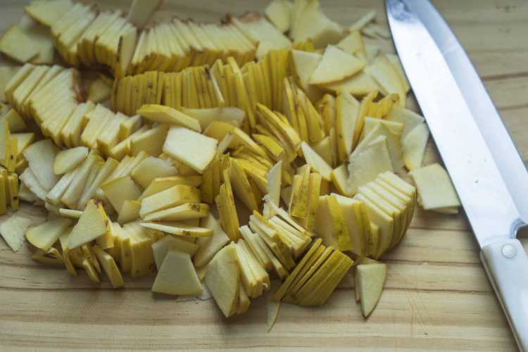 2.물기를 잘 제거한 사과와 모과는 납작하게 잘라준다.(취향에 따라 채썰기도 괜찮아요)
