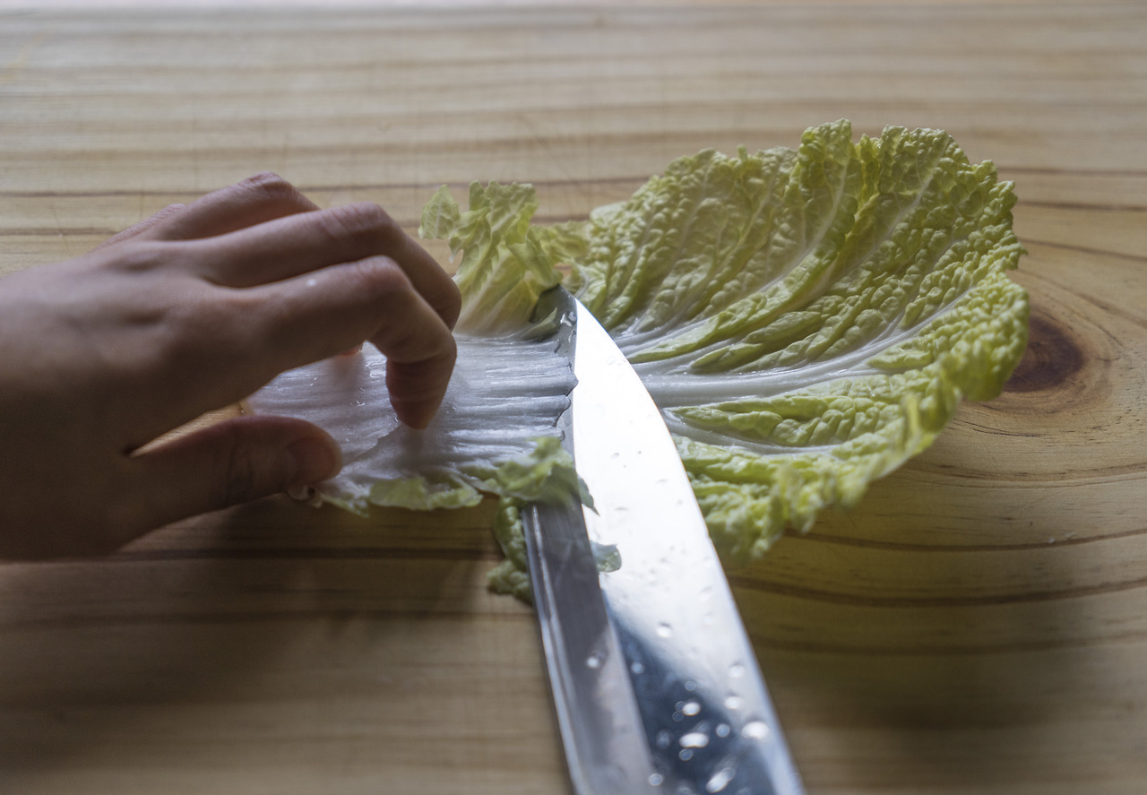 *배추는 일직선으로 자르기보다, 칼을 뉘어서 자르면 조금 더 간이 배어서 맛이 좋아요.