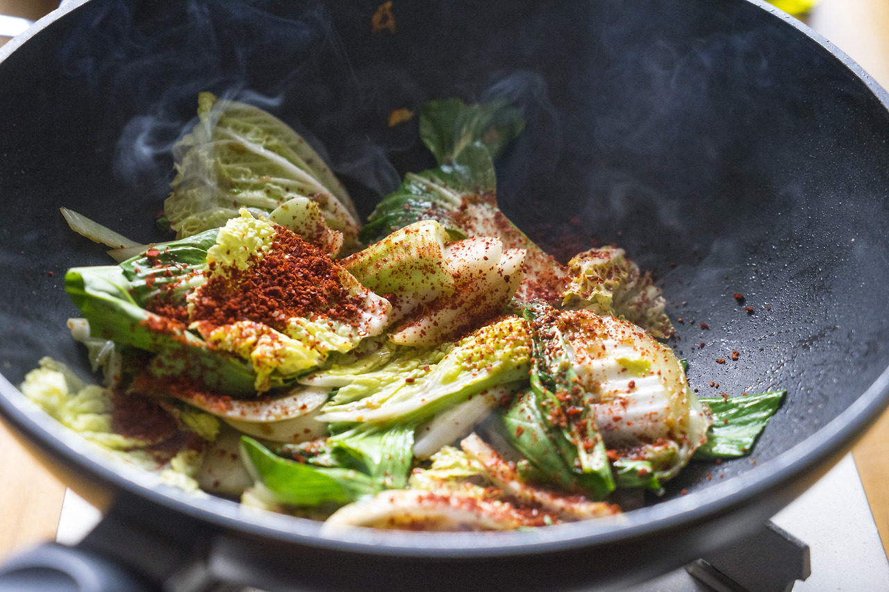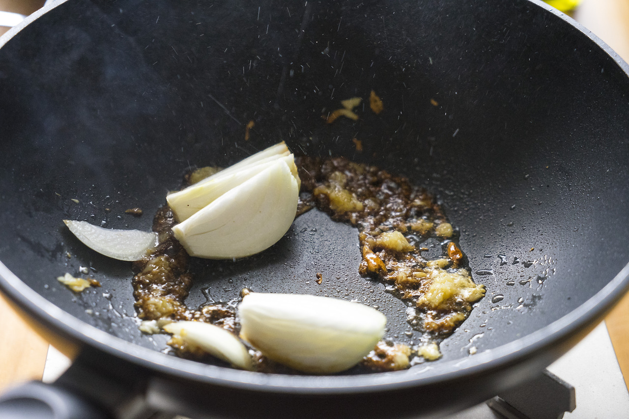 2. 여기에 센 불에서 양파를 넣고 볶다가 투명해질 때쯤, 나머지 채소들과 고춧가루, 간장, 맛술을 넣고 빠르게 볶는다. (잠깐 20~30초 볶는다 생각해요!)