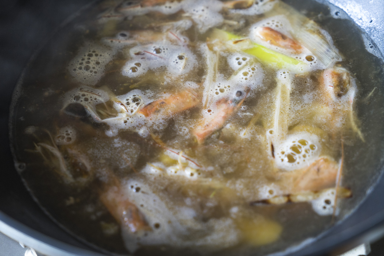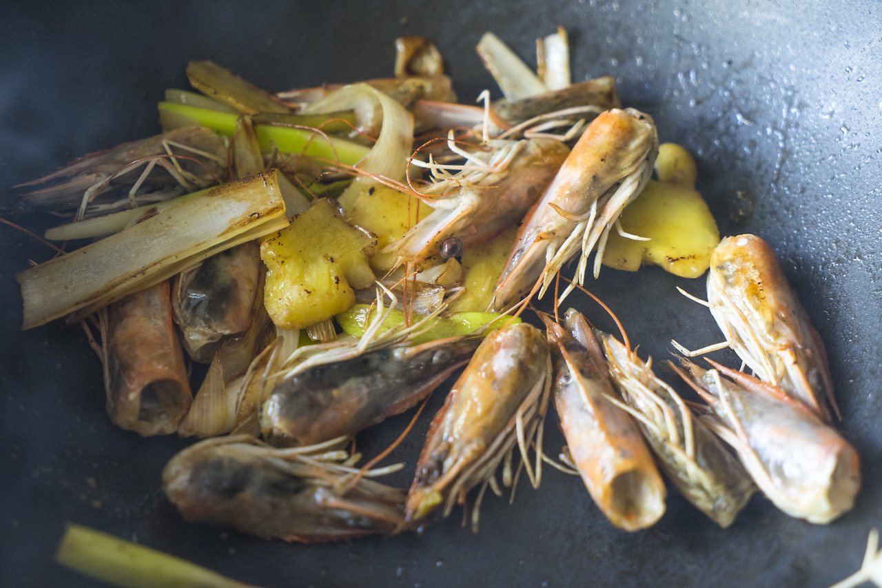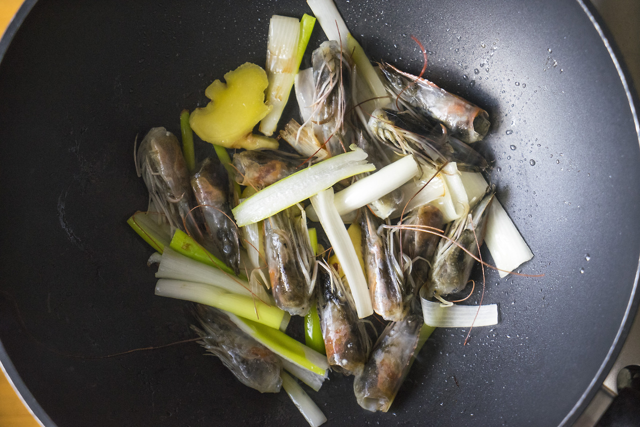 1. 팬에 기름을 두르고 새우 머리, 대파, 생강을 센 불에서 볶는다.
