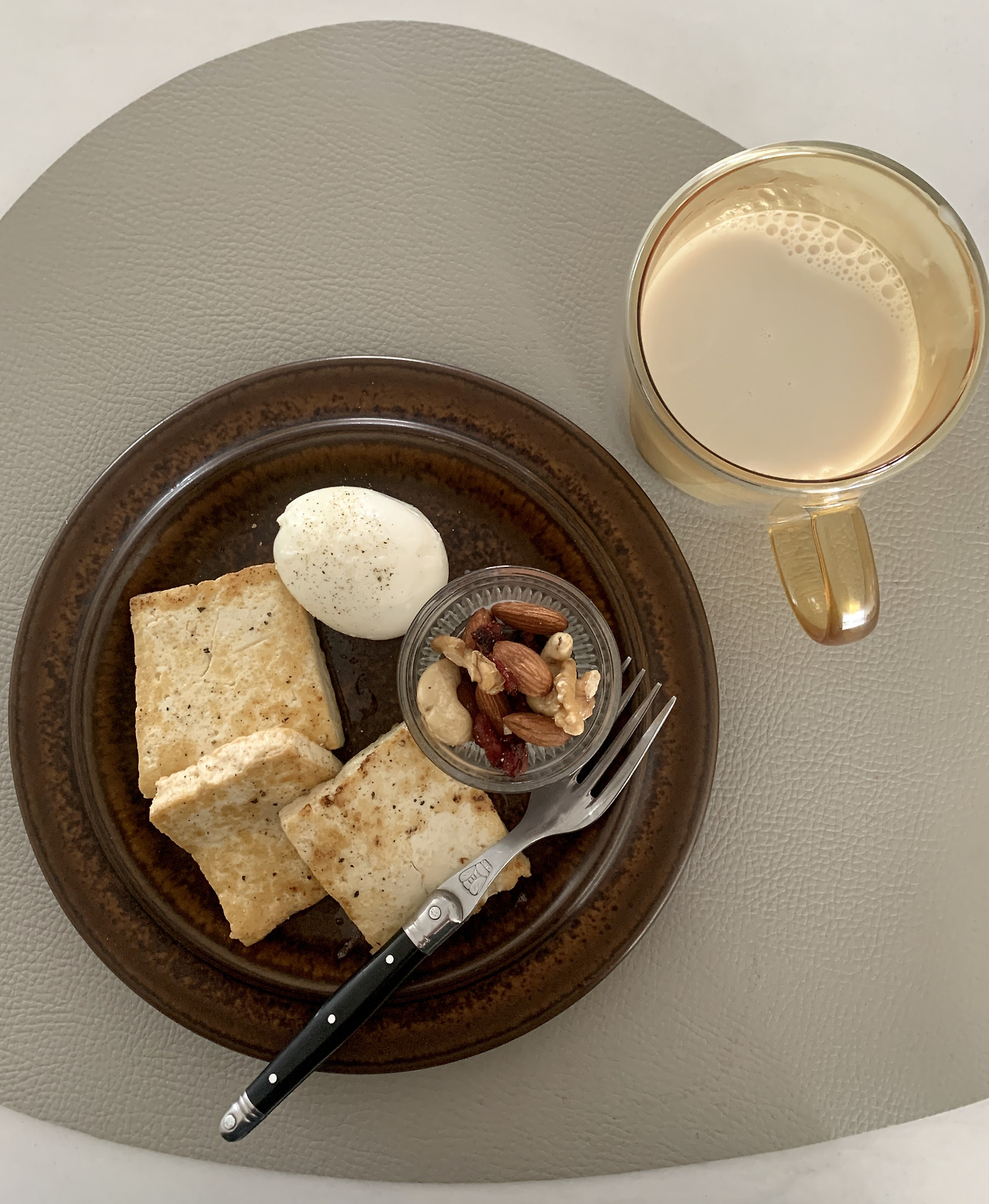 두번째로, 약간의 단백질을 메뉴 구성에 넣도록 노력합니다. 간단하게 콩으로 섭취하는 단백질이 편해서 두유를 마시거나 두유만큼 단백질이 있는 귀리우유를 마십니다.(두유는 재료, 성분을 잘 확인해서 드세요) 우유보다는 오트밀크 또는 아몬드 밀크를 선호하고요. 이런 제품이 없는 날이면 간단하게 계란, 두부 같은 식물성 단백질을 식사에 넣기도 합니다.