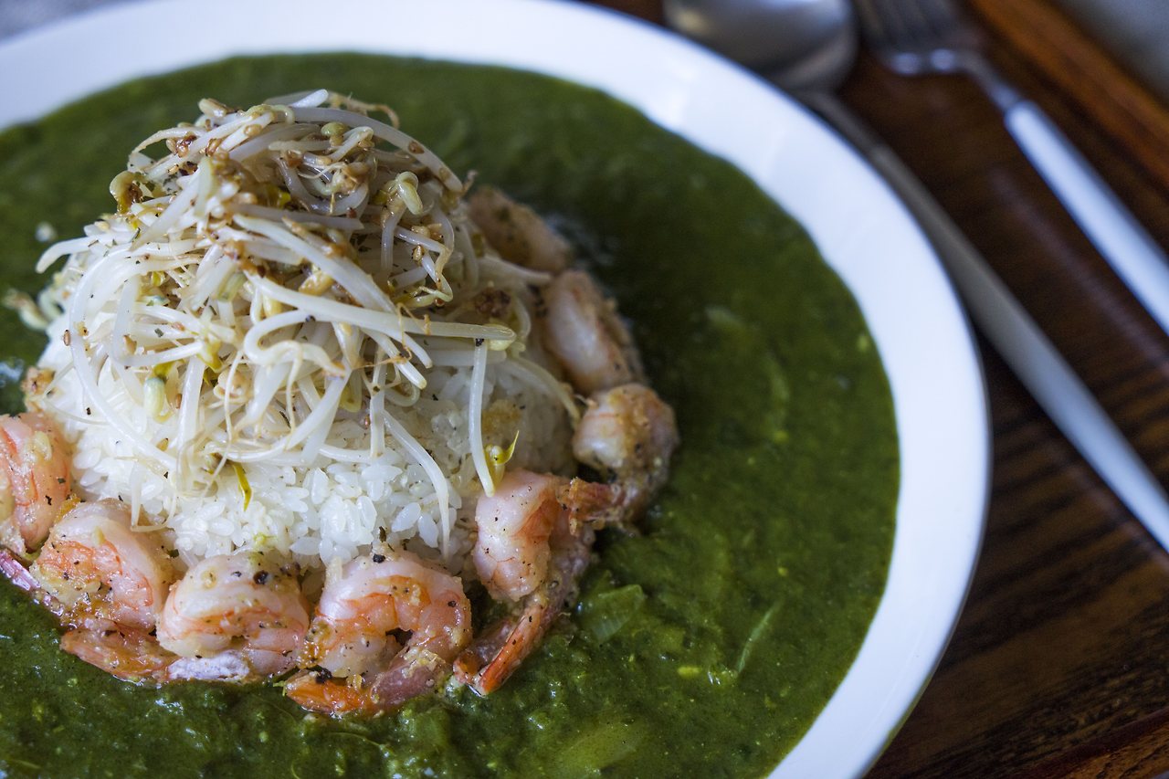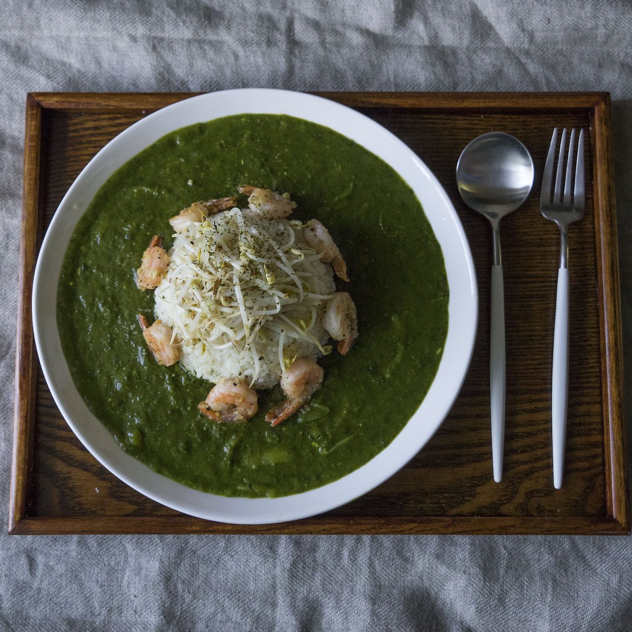 이 커리는 시금치를 갈아 만든 커리입니다. 커리와 시금치는 참 잘 어울려요. 커리와 시금치가 들어가기 전에 양파를 캬라멜라이징 했고, 양파를 캬라멜라이징 하는 과정이 사실 꽤 귀찮을 수 있지만 확실히 풍미가 좋아집니다. 그리고 토핑으로는 냉동실에 정말로 어정쩡하게 남은 새우들과 팟타이를 만들어 먹고 남은 약간의 숙주를 곁들여 보았습니다. 새우는 갈릭버터 새우이고, 숙주는 새우를 볶은 팬에 소금, 후추만 아주 약간씩 더해서 올려주었어요. 먹어보니 숙주가 씹는 재미를 주어 식감을 살려줍니다.