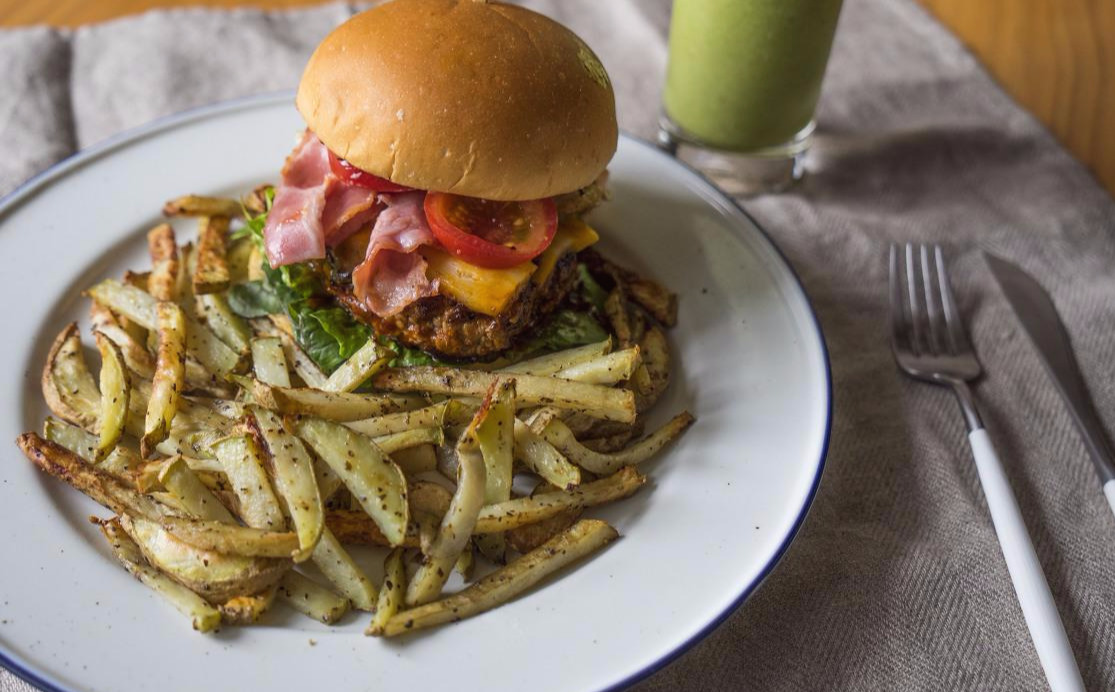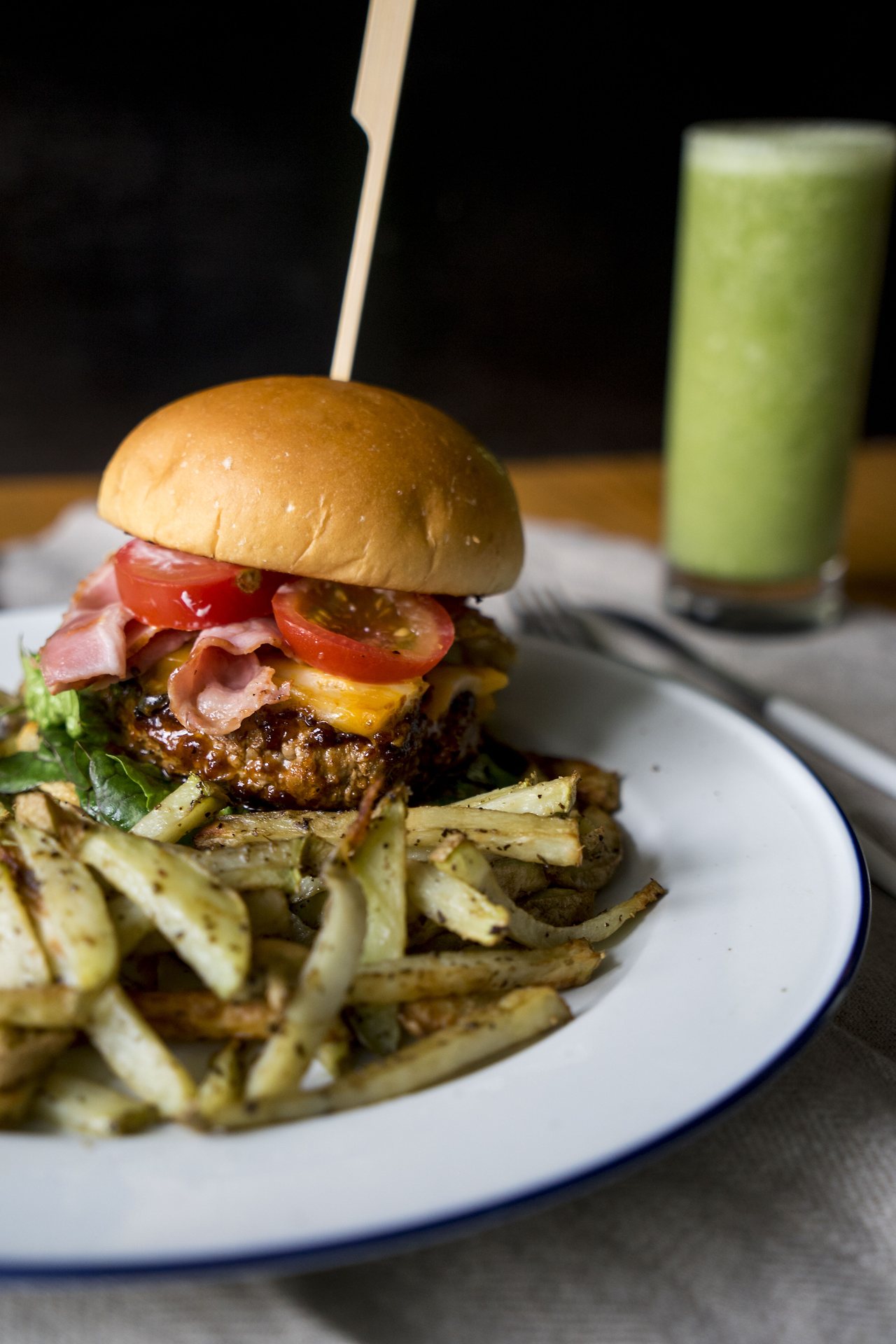 그렇게 만든 수제버거입니다. 봄이 온 줄 알고, 싹을 틔운... 감자도 심폐소생술을 했습니다. 썰어서 시즈닝만 해서 오븐에 넣으면 끝이라, 패티 굽는 동안에 금세 할 수 있지요. 신발도 튀기면 맛있다는 명언도 있지만 나름 건강함을 제 1 철학으로 하는지라 구웠습니다. 콜라 대신 케일주스를 갈았고요. 사실 햄버거에 케일주스가 왠말인가 싶지만요.