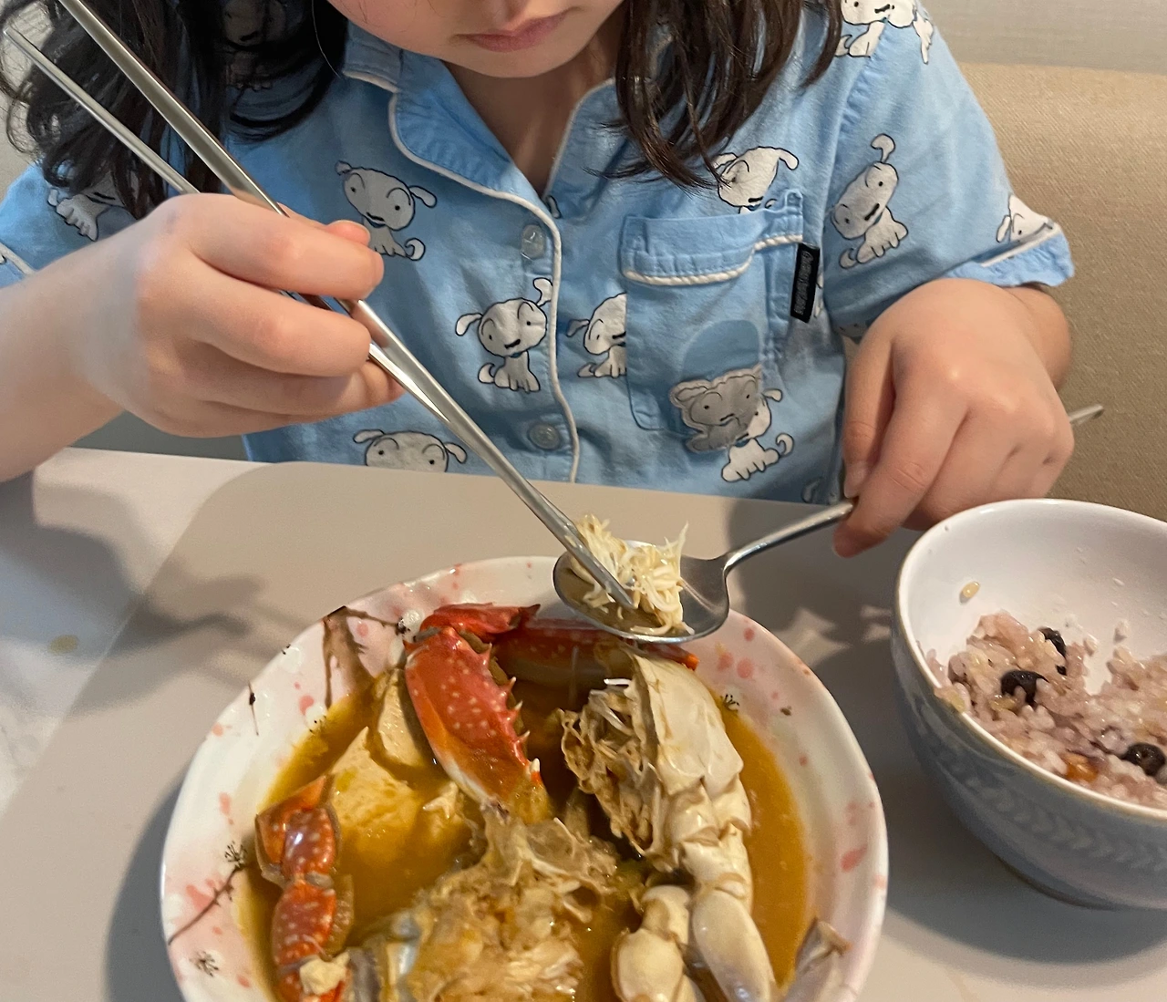 15분 전에 일어난 첫째는 주섬주섬 옷을 입는 것 같더니 식탁에 가서 앉았다. 어제저녁으로 정말 잘 먹었던 꽃게탕에 밥을 말아줬는데 ‘이거 싫어!’ 하고는 바로 일어나 다시 잠바를 입으러 가는 것이었다.