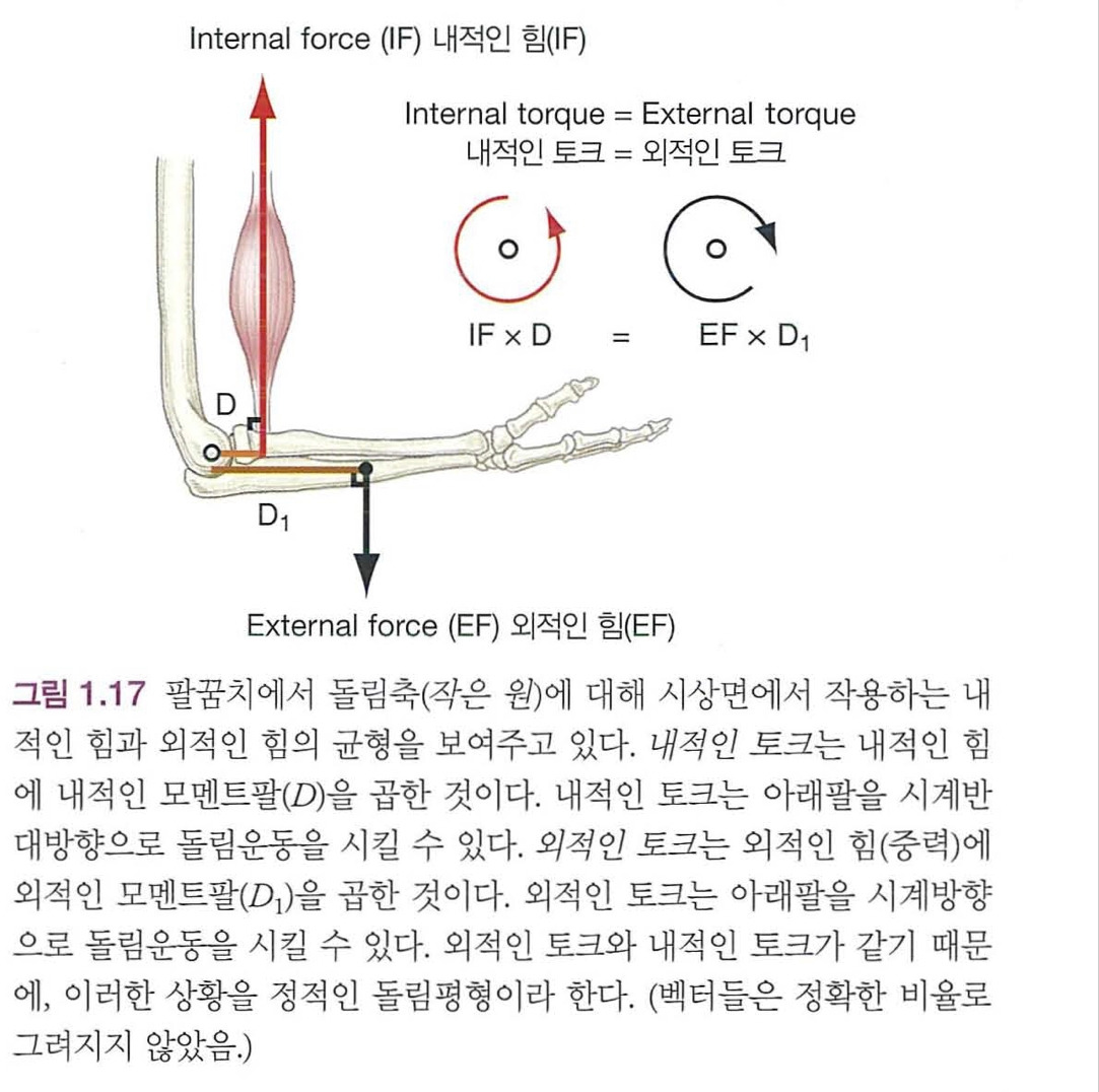 외적인 모멘트팔(그림1.17에 있는 D1)은 돌림축과 외적인 힘 사이의 수직거리이다. 외적인 토크는 팔꿈치에 대해 아래팔을 시계방향 또는 폄 방향으로 돌림운동을 시킬 수 있다. 그림 1.17에서, 대치되고 있는 내적인 토크와 외적인 토크의 크기가 똑같다고 가정되기 때문에, 관절에 대한 돌림운동은 일어나지 않는다. 이러한 상황을 정적인 돌림평형이라 한다.
