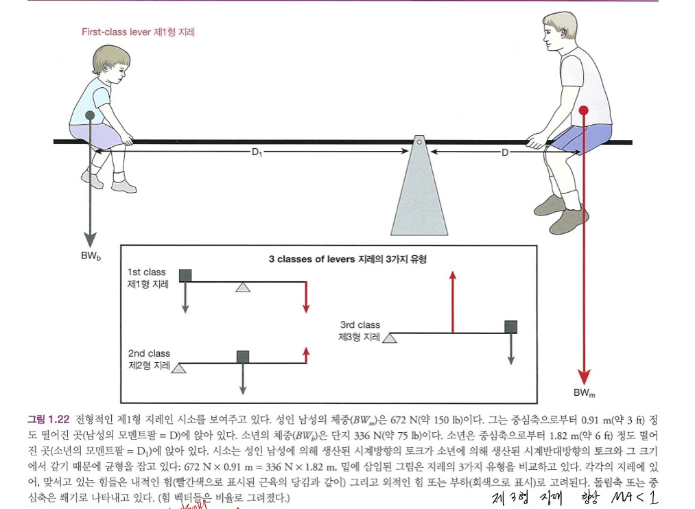 그림 1.22의 시소에서 보여주는 것과 같이, 중심축으로부터 0.91 m (약 3 ft) 정도 떨어져 앉아 있으며
