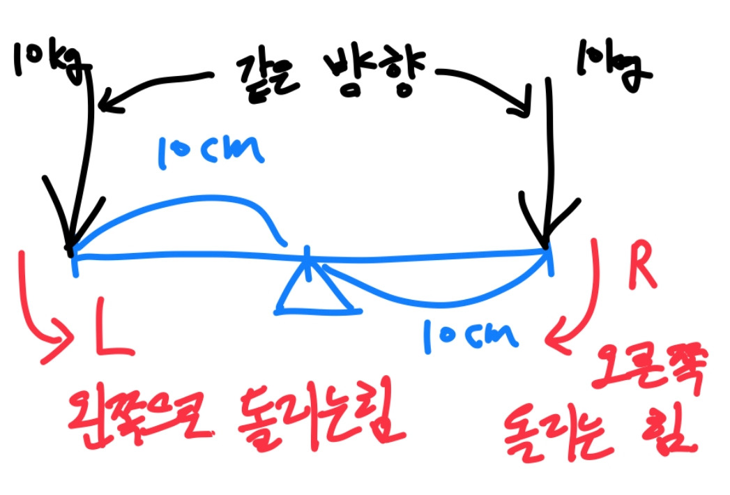+ 아래의 그림을 보면 위 글의 내용을 정리해보았다. 같은 선형 방향으로 작용하지만 서로 다른 돌림 방향을 만들어 낸다고 하는데 전 시간에 다뤘던 짝힘이라는 토크를 만드는 같은 돌림 방향을 만드는 상황도 있다는 것을 알고 있으면 좋겠다.