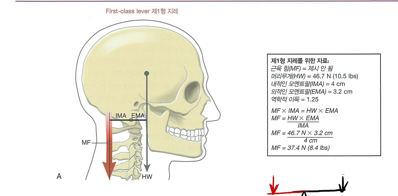 시소의 예에서처럼, 근육 힘(Muscle force, MF)에 내적인 모멘트 팔(internal moment arm, EMA)을 곱했을 때의 값과 머리의 무게(head weight, HW)에 외적인 모멘트 팔(external moment arm, EMA)을 곱했을 때의 값이 같을 때 머리는 평행 상태에 있게 된다.
