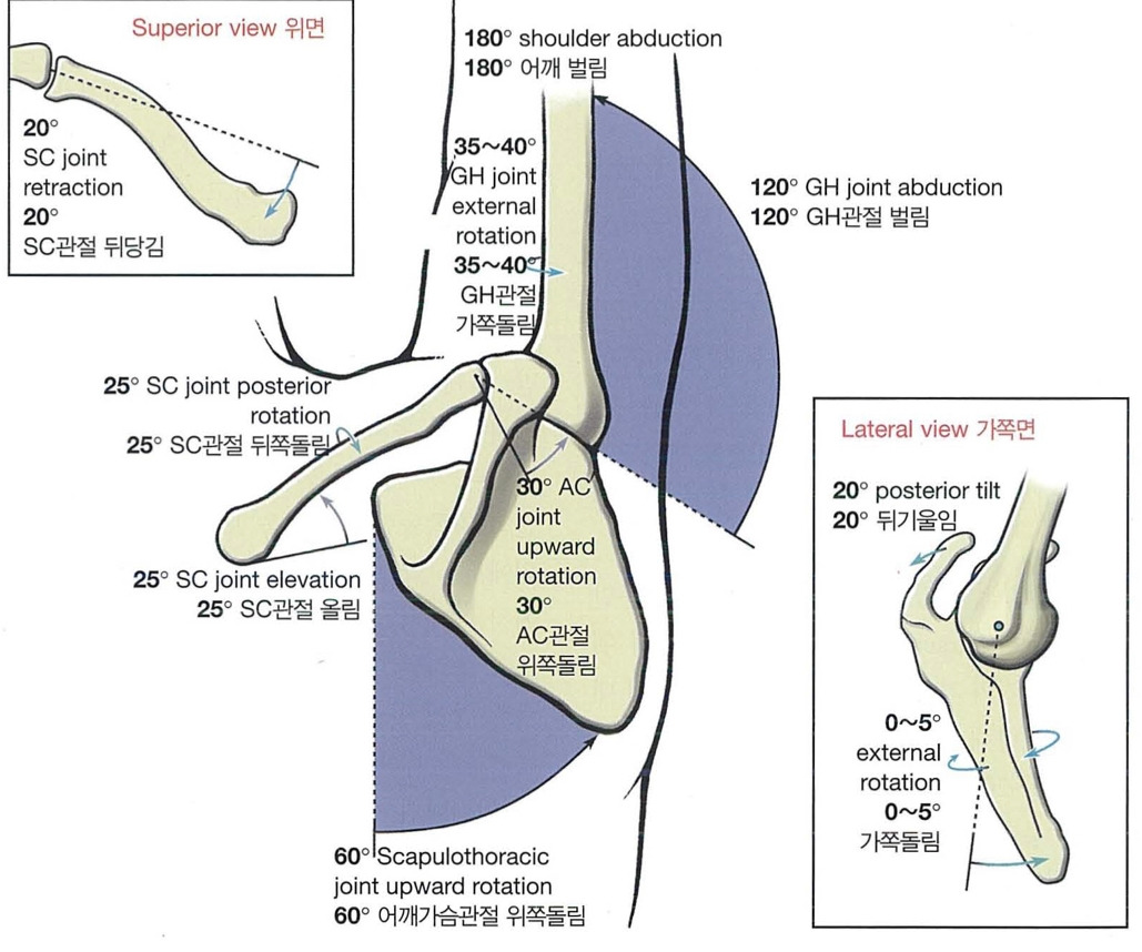 위팔뼈 움직임 범위와 어깨뼈 움직임 범위 차이가 있다.
