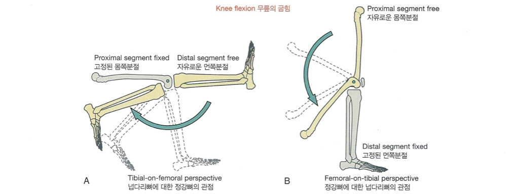 그림 1.6에서처럼 넙다리뼈에 대한 정강뼈의 움직임 그리고 정강뼈에 대한 넙다리뼈의 움직임이라는 용어는 뼈운동형상학적 관점에서 상대적 운동에 대한 개념을 설명하고 있는 것이다.