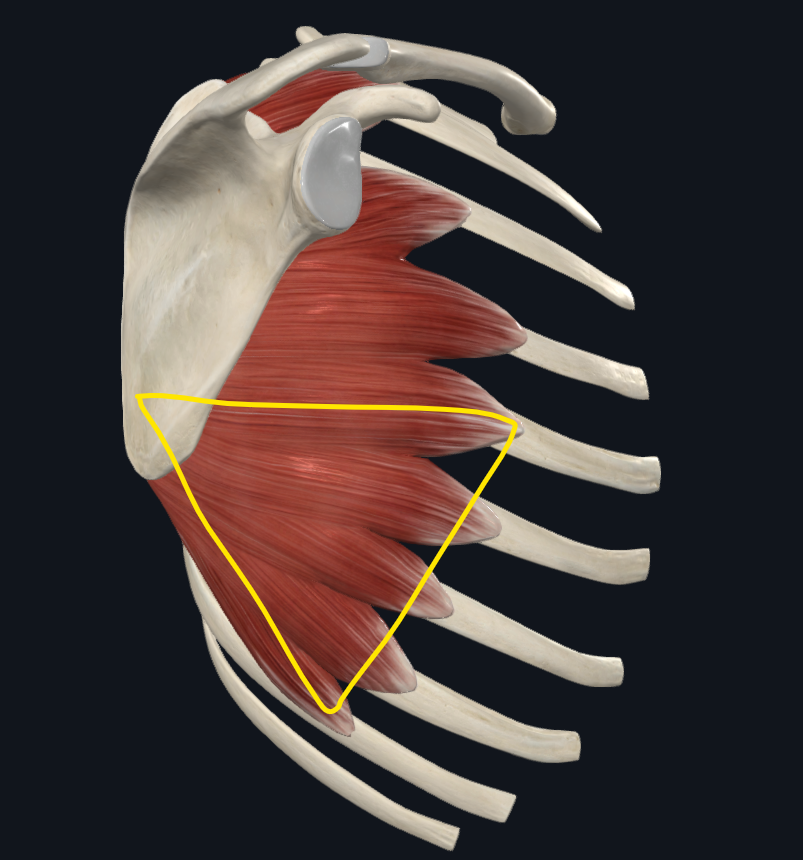 좌측의 사진처럼 노랑삼각형 영역의 근섬유들이 기능하기때문에 날개뼈 안정화하기 더 쉬워진다.