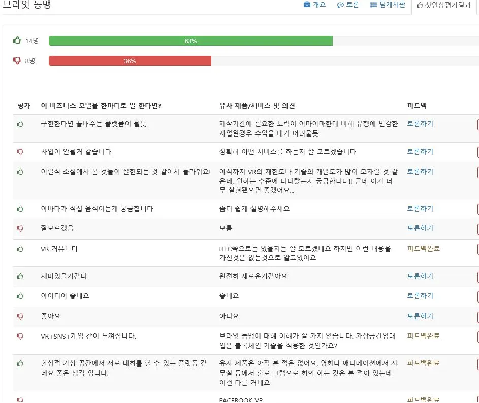 '좋아요'도 대부분 게임으로 생각하는 경향이 있었고, '별로'를 누른 사람들은 딱 들어도 뭔지 잘 모르겠다는 의견이었다. 충격을 받은 나는 다시 비즈니스 모델 설명을 뜯어고치고 모델도 좀 바꾸고.. 암튼 매일매일 생각하고 고치고 생각하고 고치고를 반복하는 중이다. 이러다가 끝이 있을지 잘 모르겠지만.