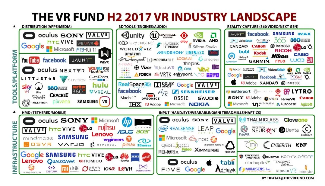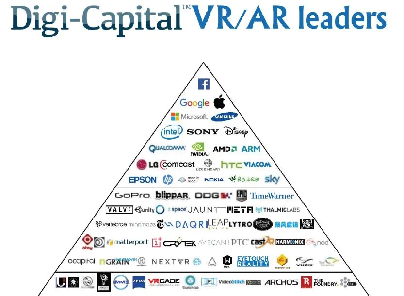 현재 VR AR 피라미드 생태계의 제일 위에는 페이스북이 있다. 그 밑으로 삼성과 LG도 보인다.