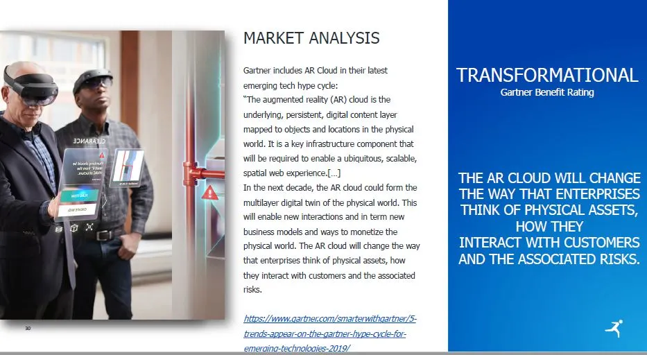 홀로렌즈 기기뿐 아니라 최신 스마트폰에 탑재된 비행시간 카메라로 주위를 파악한 후 이런 기기들을 통해 데이터를 하나로 모으면 기계가 읽을 수 있는 현실 지도가 만들어지고 이것이 바로 AR 클라우드이다.
