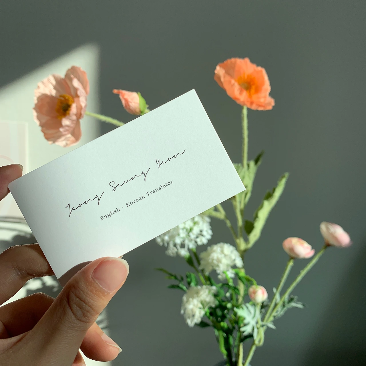 내 명함을 만져 본 사람은 종이의 무게와 질감에 놀란다. 책갈피 수준으로 빳빳해서다. 나 또한 직접 받고 이 정도로 두껍고 질이 좋을 줄은 몰랐다. 그런데 여기엔 숨겨진 의미가 있다. '이대로 죽을 순 없다'고 말하는 어느 번역가의 에세이 카피처럼 내 명함은 여러 명함 중에서도 유난히 톡톡하여 '이대로 구겨지지 않을' 예정이다. 한 사람의 명함 지갑 속 가장 튼튼한 명함이라 변색되지도 쭈그러들지도 않는다.