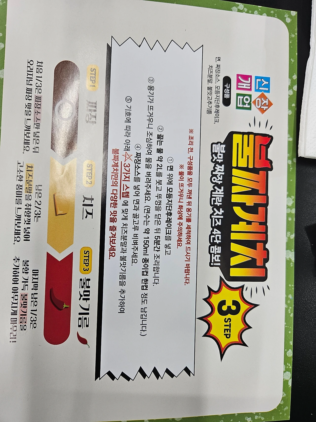 구성은 면 6인분, 짜장소스, 치즈가루, 불맛기름, 건더기스푸.