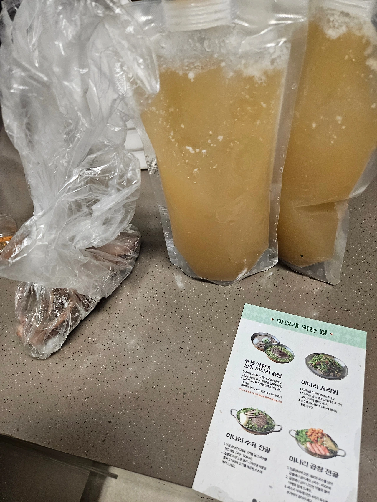 구성품은 미나리, 섞박지, 고기, 오징어젓갈, 파우치국물(파우치에 담아주어 너무 간편하고 깔끔하게 들고 갈 수 있었다_칭찬해)