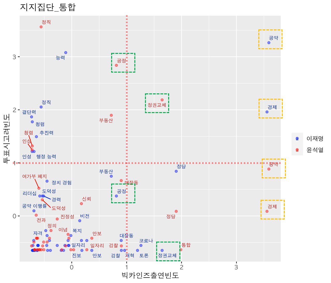 데이터를 윤석열(붉은색), 이재명(푸른색)후보자 집단으로 나누어 산점도를 다시 작성하였다. 이전 글에서와 같이 사분면은 표준편차 +1(붉은 점선으로 된 수평선과 수직선)을 기준으로 하여 구성하였다. 이번에는 응답자가 투표 시 고려한 요소와 빅카인즈에 나타난 키워드 빈도 모두 표준화하였다. 표준화를 하게 되면 스케일 크기에 관계없이 변인의 평균이 0, 표준편차가 1로 변환되어, 지금처럼 범위가 크게 다른 두 변인의 분포를 비교할 수 있다.