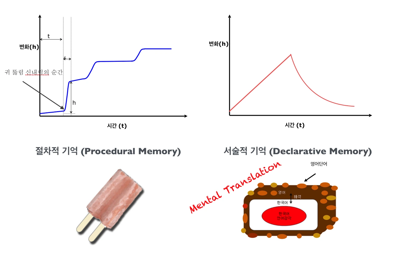 이것은 뇌인지과학적으로 이미 증명이 되었다. 문법과 단어를 평생 외워봐야 소용없다는 것은 임상을 기반으로 한 수많은 학술 논문으로 확인할 수 있다. 언어는 서술적 기억(declarative memory), 즉 암기에 의존하기보다 절차적 기억(procedural memory)에 의존한다. 절차적 기억은 우리가 자전거를 배울 때, 골프를 배울 때처럼 무엇을 '습득'할 때 의존하는 기억인 반면, 서술적 기억은 우리가 전화번호, 자동차 번호 등을 '암기'할 때 동원되는 뇌기능이다.