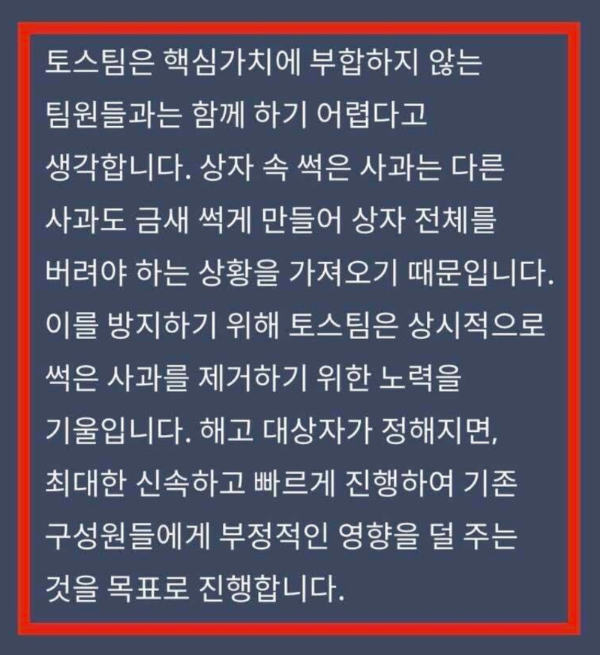 대외적으로 '자율 휴가제'를 운영하는 회사로는 미국의 넷플릭스, 한국에서는 토스가 있습니다. 휴가뿐 아니라 많은 부분에서 '자율'을 강조하는 회사들입니다. 그런데 이 두 회사의 또 하나의 공통점은 상시적으로 구조조정을 한다는 것입니다. 자유로운 미국에서는 해고로, 고용노동법이 경직되어 있는 한국에서는 간접적으로 권고사직을 통해 매년 20% 정도의 인원을 내보내고 있습니다. (토스는 한 때 44% 정도의 연간 퇴사율을 보였습니다.) 직원에게 '자율'의 권리를 주는 대신, 회사는 강력한 Self-discipline을 요구할 권리를 갖는 겁니다. 토스는 한 때 홈피에 '상자 속 썩은 사과는 다른 사과도 금세 썩게 만들어 상자 전체를 버려야 하는 상황을 가져온다. 그래서 상시로 썩은 사과를 제거하기 위해 노력한다.'라고 홈피에 게재하기도 했었습니다.