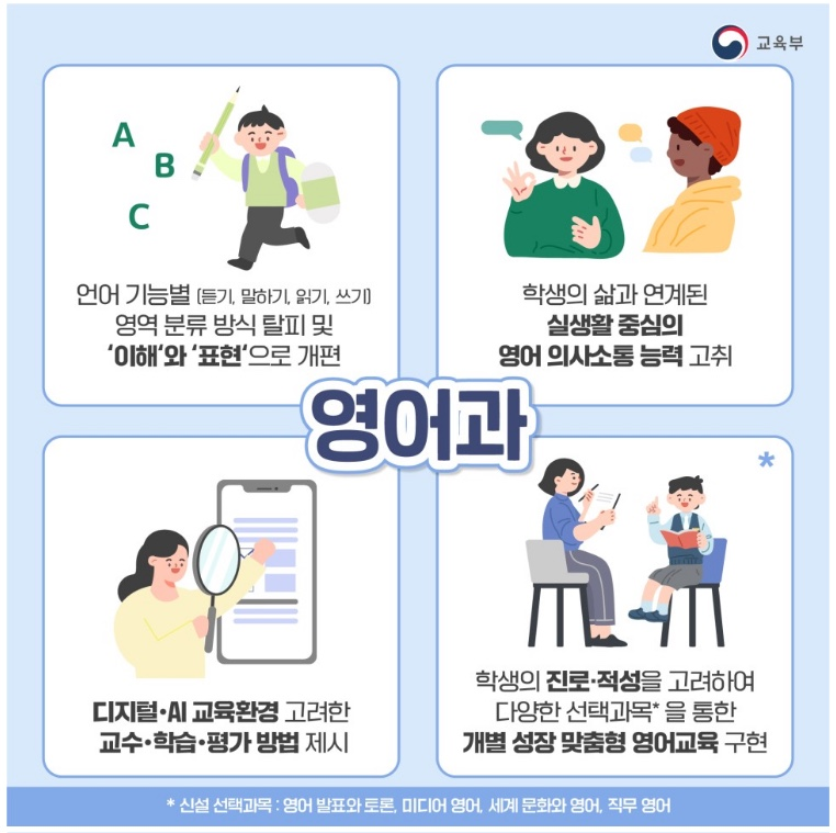 2022년 개정 교과과정에 의하면 영어 교육의 목표는 수능 시험 1등급, TOEIC 900점 이상 획득이 아니다. 더 이상 4 Skill (듣기, 읽기, 말하기, 쓰기) 분류 중심의 훈련이 아닌 이해와 표현으로 접근, 실생활 중심의 영어 의사소통 능력 고취, 진로 적성을 고려한 개별 성장 맞춤형 영어교육 구현이다. 좋은 목표를 정했으니 이젠 실천할 일만 남았다.