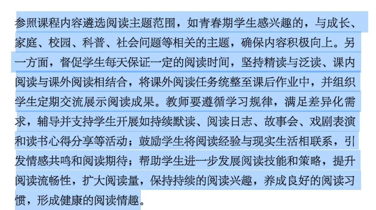 다른 한편으로는 학생들이 매일 일정한 독서 시간을 확보하도록 독려하고, 정독과 다독, 수업 내 독서와 과외 독서를 결합하여 독서 과제를 숙제로 통합하고, 정기적으로 독서 성과를 발표하도록 해야 합니다. 교사는 학습의 규칙을 따르고, 학생들의 차별화된 요구를 충족시키며, 지속적 조용한 독서, 독서 일지, 이야기회, 연극 공연, 독서 감상문 공유 등의 활동을 지도하고 지원해야 합니다. 또한 학생들이 독서 경험을 현실 생활과 연결시켜 감정적 공감과 독서 기대를 불러일으키도록 격려해야 합니다. 학생들이 독서 기술과 전략을 더욱 발전시키고, 독서 유창성을 높이며, 독서량을 늘리고, 지속적인 독서 관심을 유지하며, 좋은 독서 습관을 기르고, 건강한 독서 취미를 형성하도록 도와야 합니다.