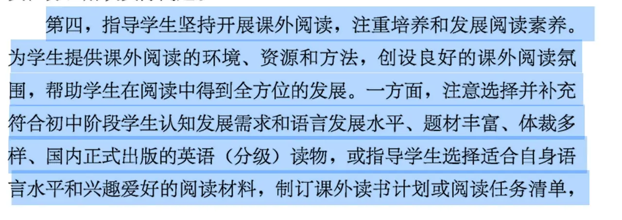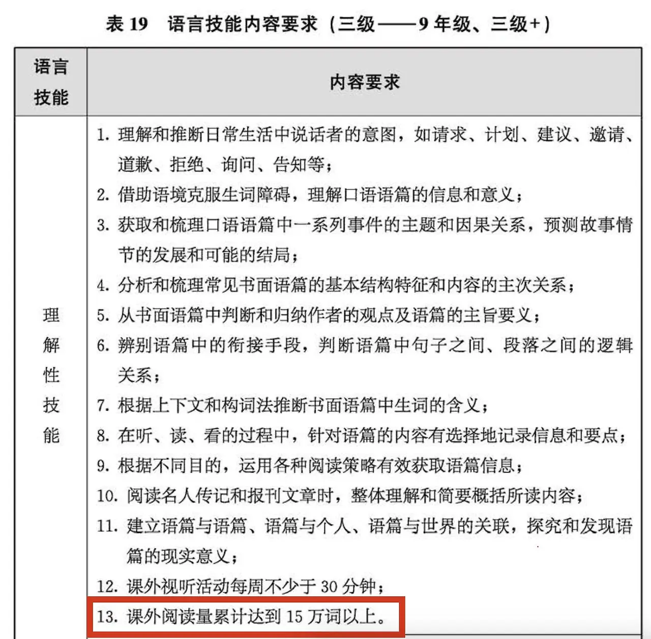 9. 중화인민공화국 교육부의 2022년 <영어과정표준> p40에는 아래와 같은 내용이 나온다. '과외'로 영어 독서를 장려하라는 내용이다. 그리고 학년별 최소 독서량을 제시한다. 중3의 경우 최소 15만 단어 분량. 리딩앤 레벨 7~9 기준으로 130권 정도 된다. 아래 글을 읽고 울고 싶어졌다. 나는 중국이 무섭다.