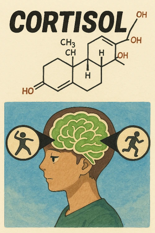 우리가 길을 가다 멧돼지를 만났다고 치자. 상상해 보자. 어떤 생각이 들까? 앞이 캄캄할 것이다. 도망쳐야 할까? 아니면 겁을 줘서 도망가게 해야 할까? 이 순간 우리 몸에서는 각종 긴장 호르몬이 분비된다. 그중 스트레스 호르몬인 코르티솔(cortisol, C₁₁H₃₀O₅)이 중요한 역할을 한다. 코르티솔은 흔히 ‘싸울래 아님 튈래(Fight or Flight)’ 호르몬으로 불린다. 생존이 걸린 순간이기 때문에, 소화 기능과 언어 중추는 일시적으로 마비된다. 지금은 먹을 때가 아니라 오히려 먹힐 상황이고, 멧돼지와 말로 해결할 수도 없기 때문이다. 코르티솔은 오직 도망칠지 맞설지 빠르게 결정하고, 근육이 반응할 수 있도록 온 신경을 집중시킨다.