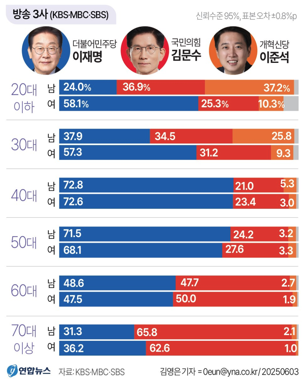 이번 대통령 선거에서도 세대 간의 격차는 파란색, 빨간색, 주황색 그래프로 확연히 드러났다. 그런데 특이한 점은 세대 간의 격차보다 2030의 남녀 간의 대립이다.