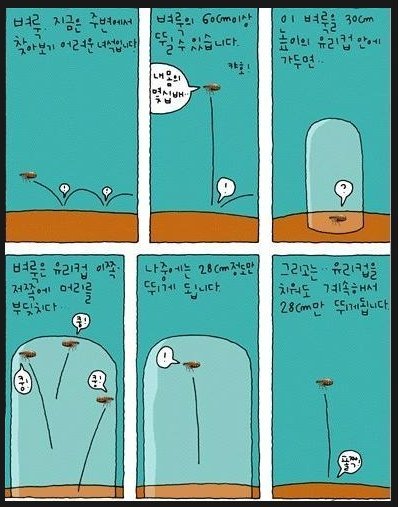 그런데 말이다. 이 벼룩 실험은 실제 실행한 적이 없는 우화적 비유일 뿐이다. 실제로 유리병을 치우면 벼룩은 생존 본능으로 더 높이 뛴다. 우린 벼룩보다 못한 존재인가?