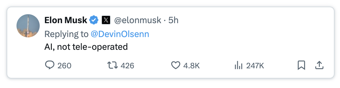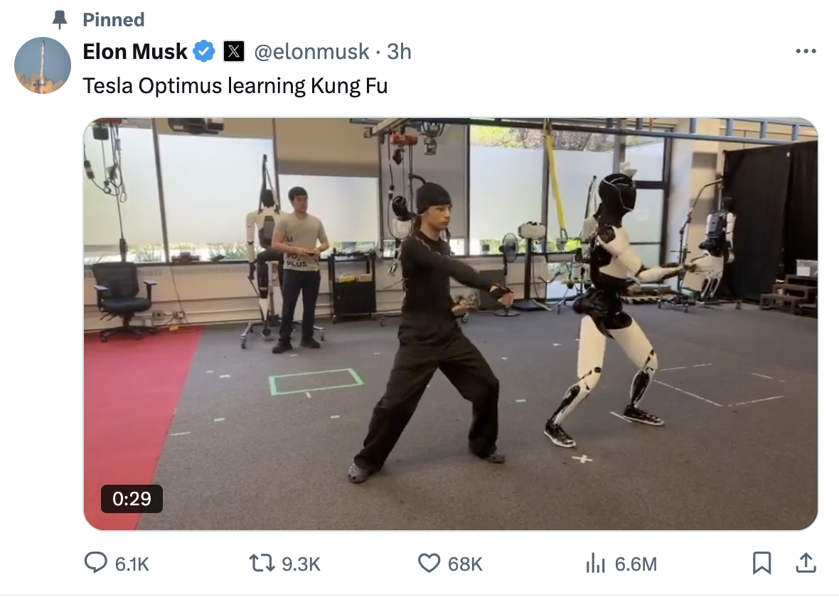 3시간 전에 일론 머스크가 공개한 영상이 화제입니다. 테슬라의 휴머노이드 로봇 옵티머스가 사람과 함께 쿵후 자세를 따라 하는 모습을 보여준 것인데요. 많은 사람들이 사람이 뒤에서 조종하는 거 아닌지 의심했는데, 머스크는 단호하게 AI, not tele-operated(사람이 조종한 게 아닌 AI로 작동)라고 트위터로 답했습니다.