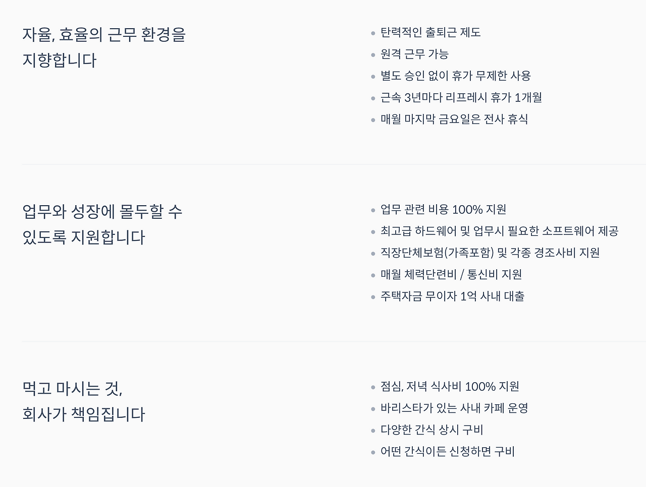 실제로 토스에서는 인재 확보에 필요한 다양한 복지혜택을 입사 후에도 계속 업무에 지장 주지 않고 몰입될 수 있도록 환경을 조성한다고 한다. 직원들은 특별한 승인 절차 없이 연중 무제한으로 휴가 가능하며, 자율 출퇴근제, 원격, 재택근무도 가능하다고 한다. 전세 및 매매 무이자 1억 원 대출 등 파격적인 복지를 자랑하고 있다.