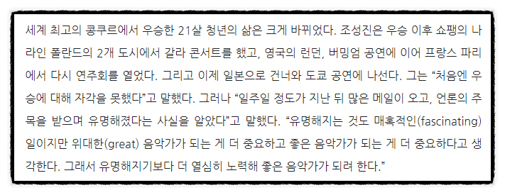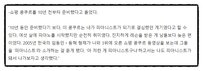 결론을 말하자면, 유명한 피아니스트가 된다는 것은 실력을 바탕으로 정보 싸움에서 이기는 것이라고 생각해요. 그 첫 단추가 '유명한 스승을 찾는 것'에서부터 시작하니 말이죠.