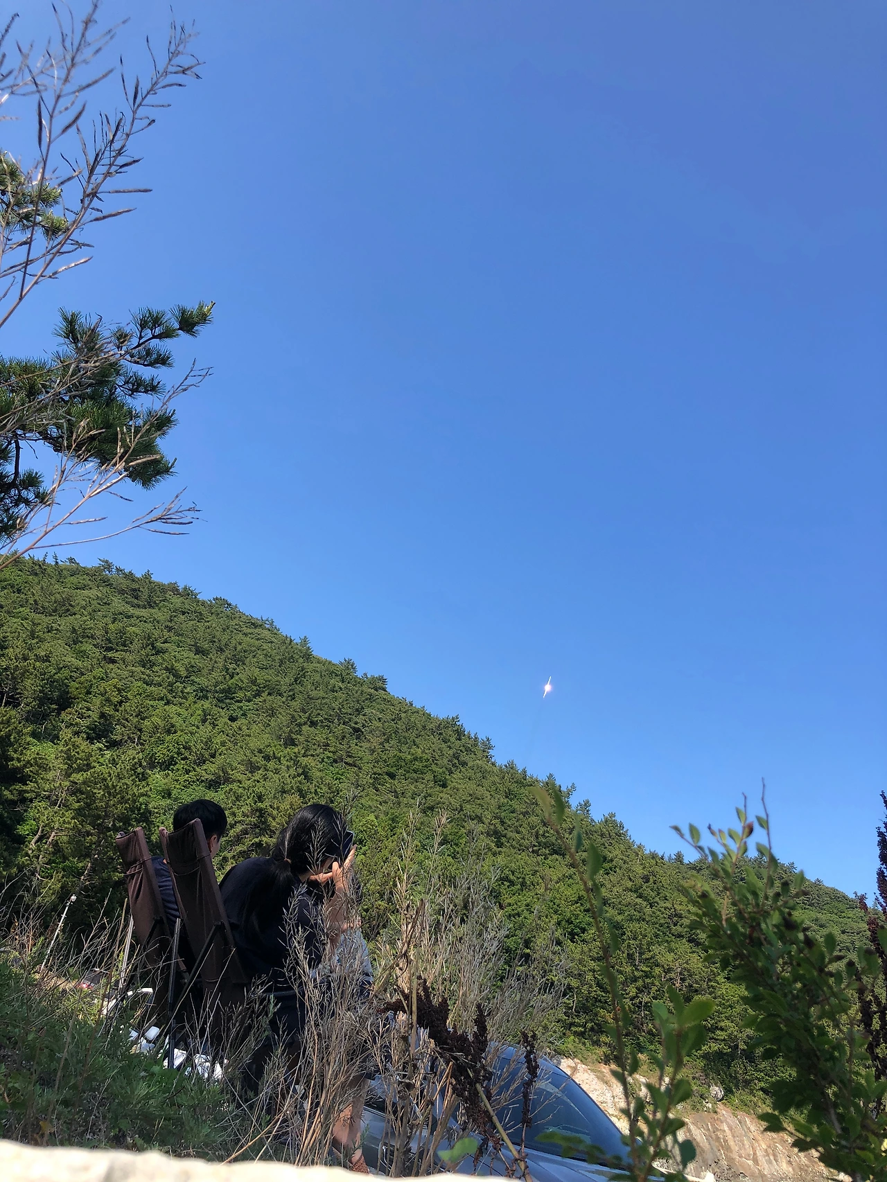 그렇게 예정된 발사 시각이 다가왔고 영화에서 처럼 땅이 진동하진 않았다. 굉음을 울리고 산등성이를 막 벗어난 로켓이 우리 눈에 아주 크게 보였다. 찌지직 소리를 내며 하늘로 솟구쳐 올랐다. 나는 로켓이 가시거리에서 사라질 때까지 추락하진 않을까 생각하며 계속해서 지켜보았다. 우리 딸은 아무것도 모른 채 그냥 끌려왔을 테고 아들은 로켓이 무엇인지는 알았으나 잠깐 로켓 발사 순간에 흥미를 가지다 유튜브에 더 꽂혀있었다. 그날 아들은 로켓에 앉아 무사히 달나라에 도착해 바닷가 누나를 만났을까.