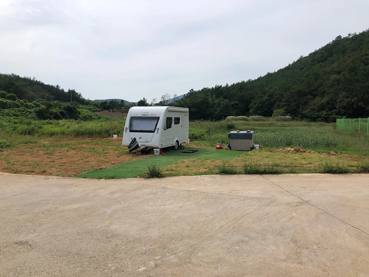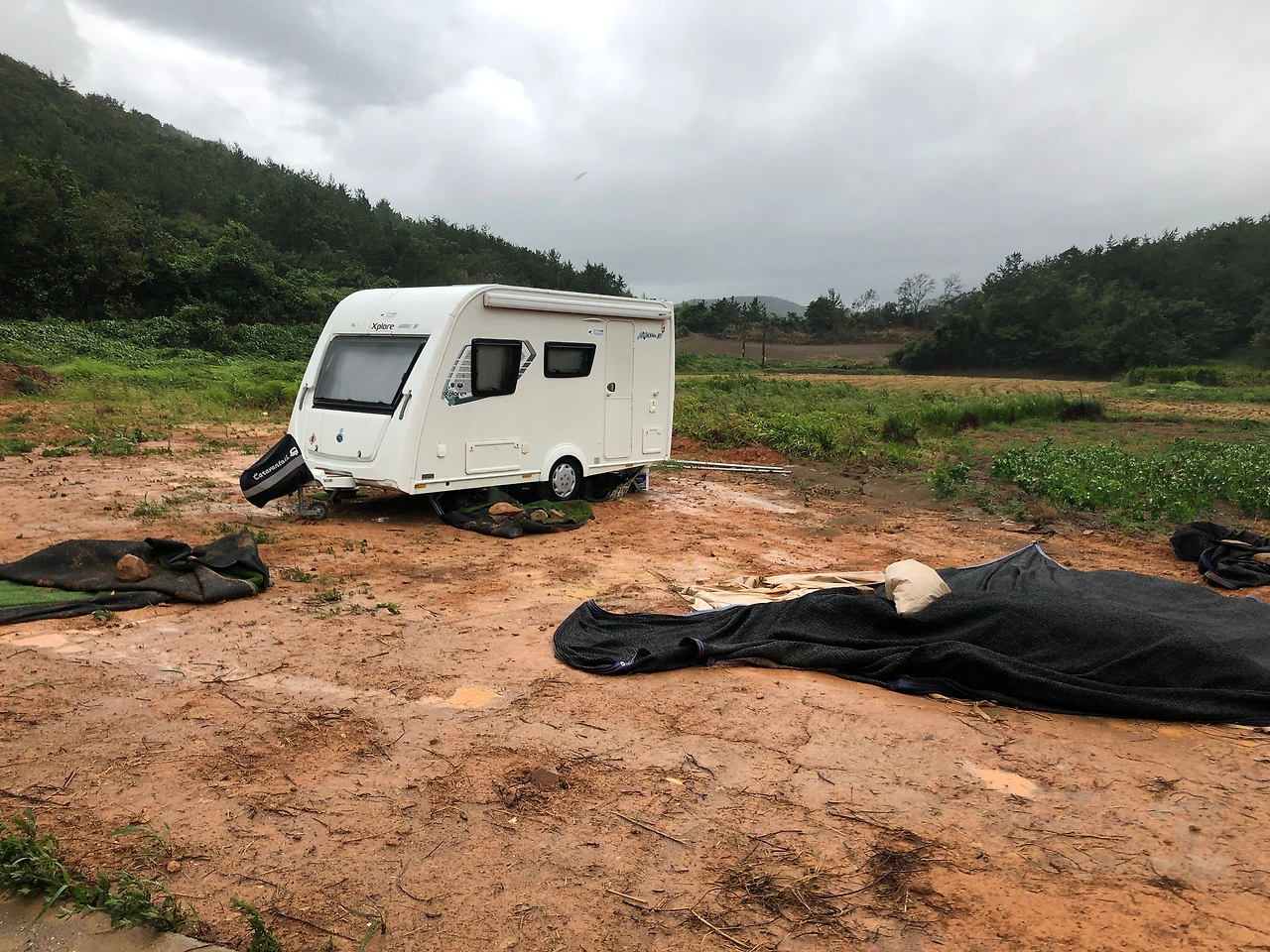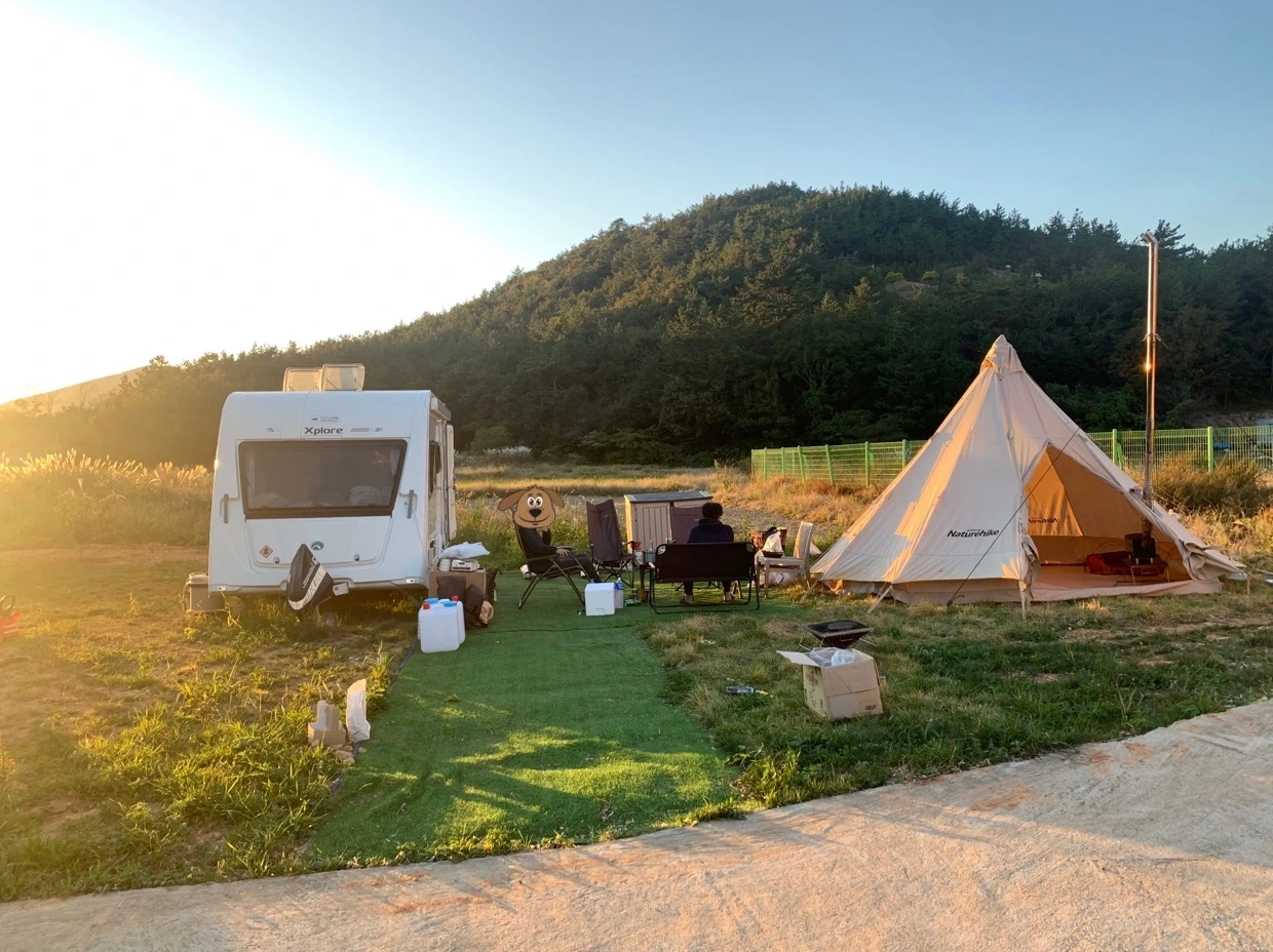 비록 흙바닥이지만 이제 땅도 평탄화 되었겠다 모든 것이 끝나고 행복한 캠핑의 시작인 줄 알았다. 카라반이 좁아 가성비 좋은 중국산 티피 텐트도 장만했다. 그때부터가 시작이었다. 진흙인 맨바닥에 텐트를 치니 온갖 문제가 거기서 돌출했다.