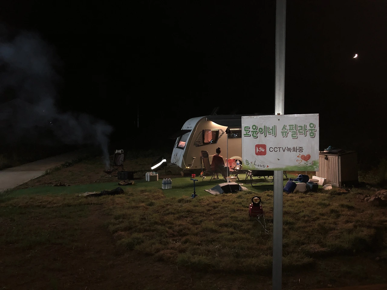 비가 오면 땅이 젖어 텐트 안팎이 흙 난리가 나기도 하고 바람이 강하게 불어 눈앞에서 텐트 한 귀퉁이가 찢겨 날아가는 걸 아들과 생생하게 지켜보기도 했다. 아들 녀석이 재밌다며 아빠 저기 좀 보라며 웃었다. 슈필라움이 평소에도 바람이 센 곳이긴 하지만 하필 일본으로 향한다던 태풍이 여수 쪽에 상륙한 날이었다. 카라반이 좌우로 크게 흔들려 불안감에 잠도 설쳤다. 카라반이 강풍에 넘어가지 않을까 하는 걱정에 새벽에 일어나 1m 말뚝을 카라반 양옆에 박아 고정시켰다. 큰 맘먹고 산 인조잔디 네 모서리에 큰 돌을 놓아 고정시켰는데 모양이 다 흐트러졌다. 바람이 어마어마하게 불어서 빗방울에 뺨을 얻어맞을 수도 있구나 느낀 하루였다. 우리는 서둘러 슈필라움을 내팽개치고 집으로 복귀했다.