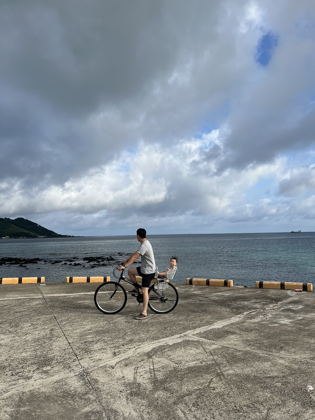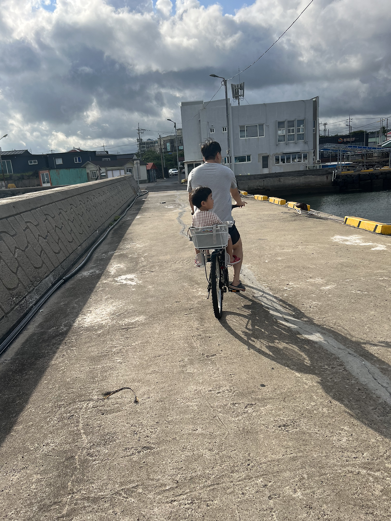 그러다 지쳐 방파제 그늘막에 앉아서 바닷속을 응시하면서 아이스크림을 마저 먹었다. 너무 맑아서 주머니에 핸드폰이 없었고 아들이 없었다면 그냥 뛰어들고 싶었다. 결국 그 바다에서 스노클링을 하지 못해 아쉽다. 포구 마을을 지나고 있었는데 동네 할머니가 개가 집을 나갔다며 혹시 봤냐고 물었다. 도윤이한테 물어보니 못 봤다고 해서 겸연쩍게 웃으며 할머니께 못 봤다고 했다. 방파제 끝에 있는 정자에 누워 조금 쉬다 아들과 빨간 자전거를 뒷자리에 태우고 집으로 돌아갔다. 잠에서 막 깬 딸아이와 온 가족이 점심을 먹으며 오후엔 무엇을 할까 아내와 고민했다. 한량 부부의 제주도 일상이었다.