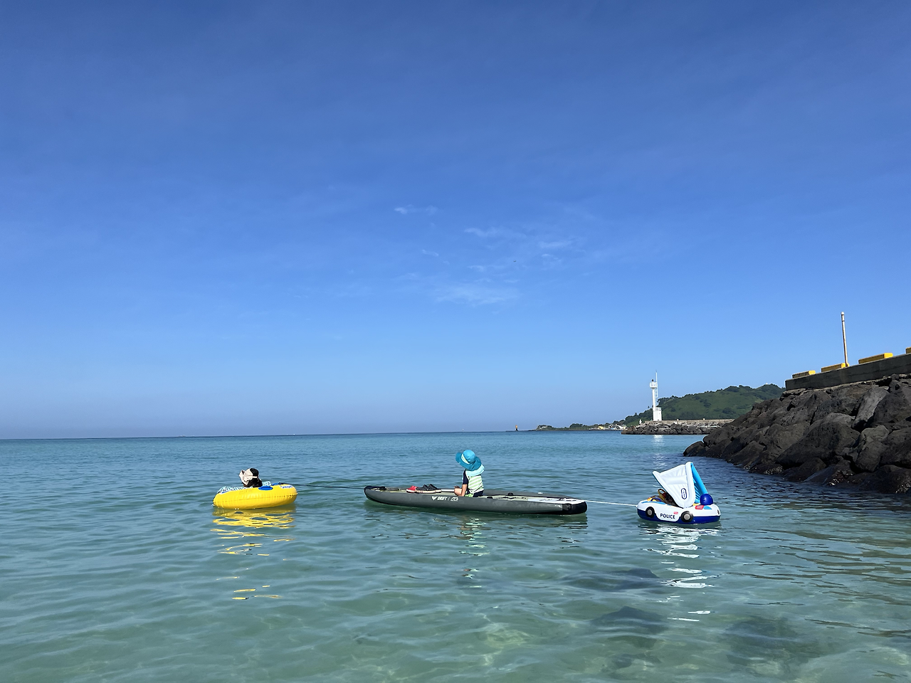 근처 방파제 모래 해변에서 수영하고 있던 아내와 딸에게 갔다. 바다가 잔잔해 도윤이는 안정적으로 앉아있었고 아내와 딸의 튜브를 패들보드 앞뒤에 묶어 바다 기차놀이를 했다. 에메랄드빛 제주바다에서 가족과 함께 누리는 호사였다.
