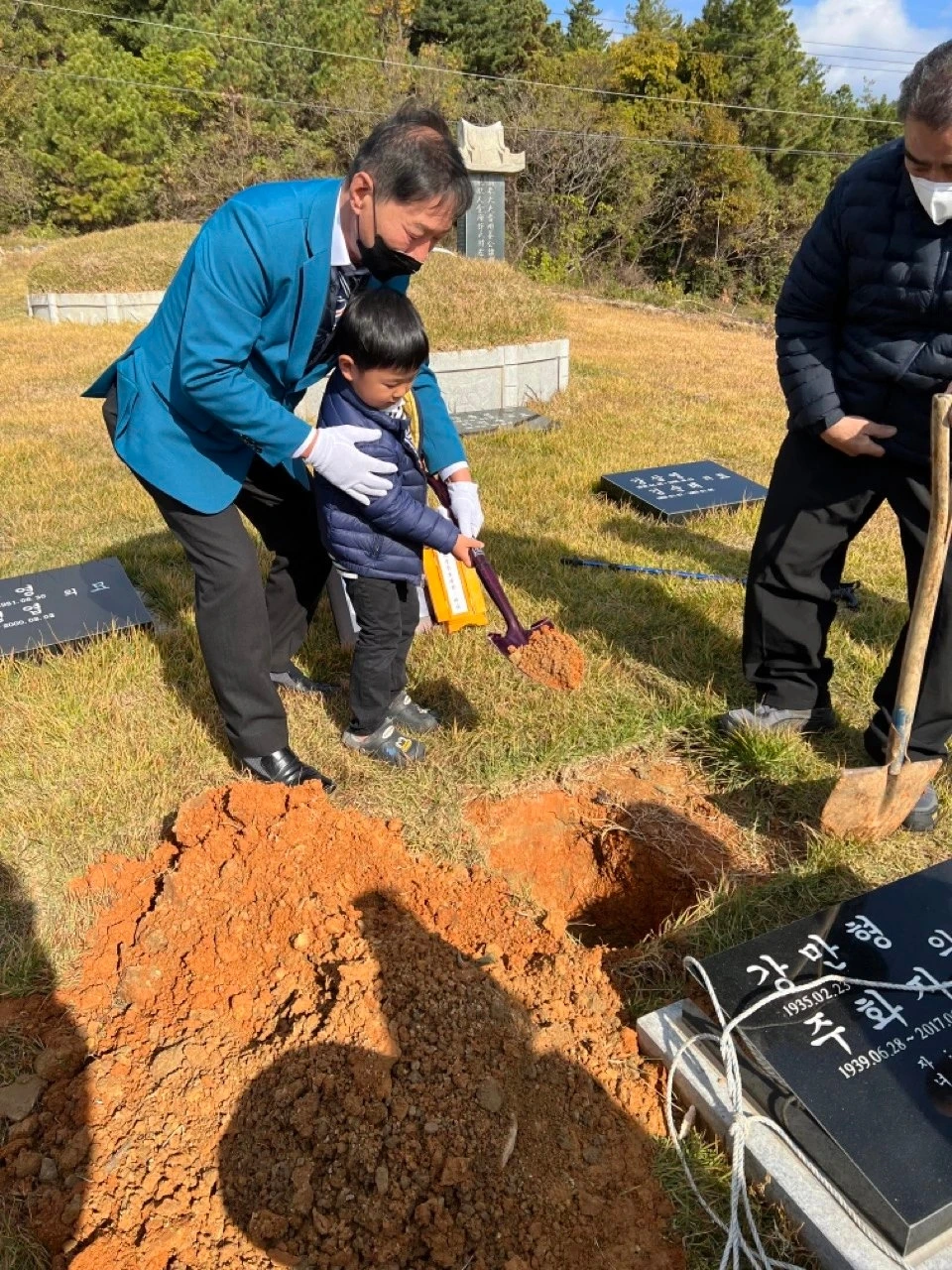 할아버지는 외할머니 옆에 묻히셨다. 트렁크에 있던 어린이용 삽을 도윤이에게 주었다. 그 삽으로 도윤이는 할아버지에게 따뜻한 이불을 덮어드린 다는 마음으로 흙을 뿌렸고 나도 그 삽으로 다연이와 함께 마지막으로 흙을 뿌렸다. 그렇게 할아버지와 물리적으로 영영 볼 수 없게 되었다.