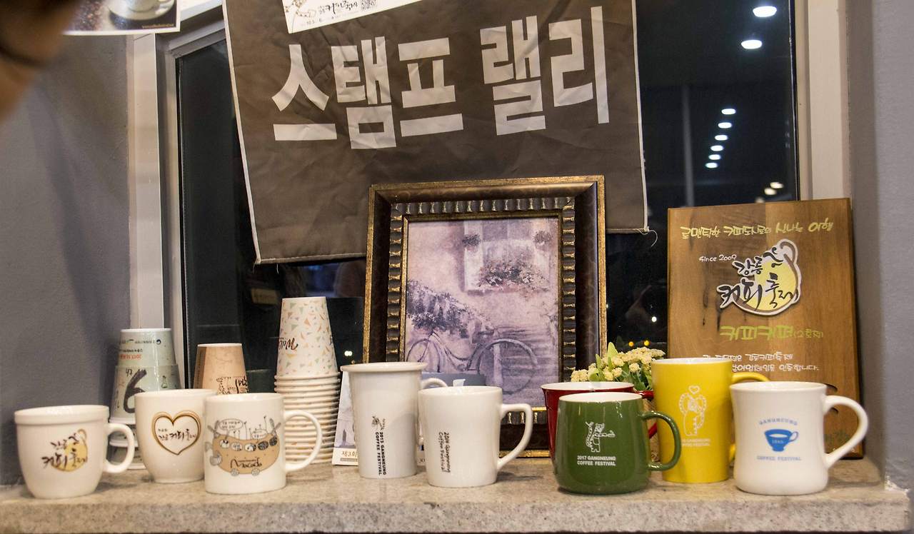 10월 초 허난설헌 근처에서 전국 유일하게 열리는 커피축제는 올해로 10회를 맞이하며 그 기념컵 10개가 전시되어 있다.
