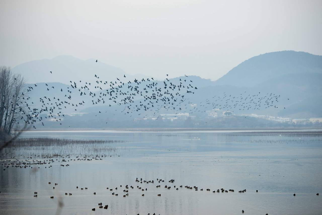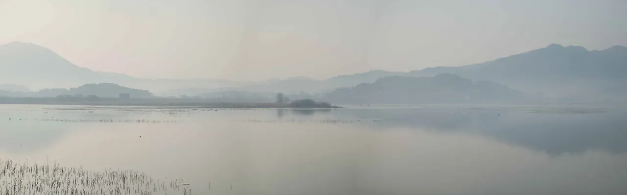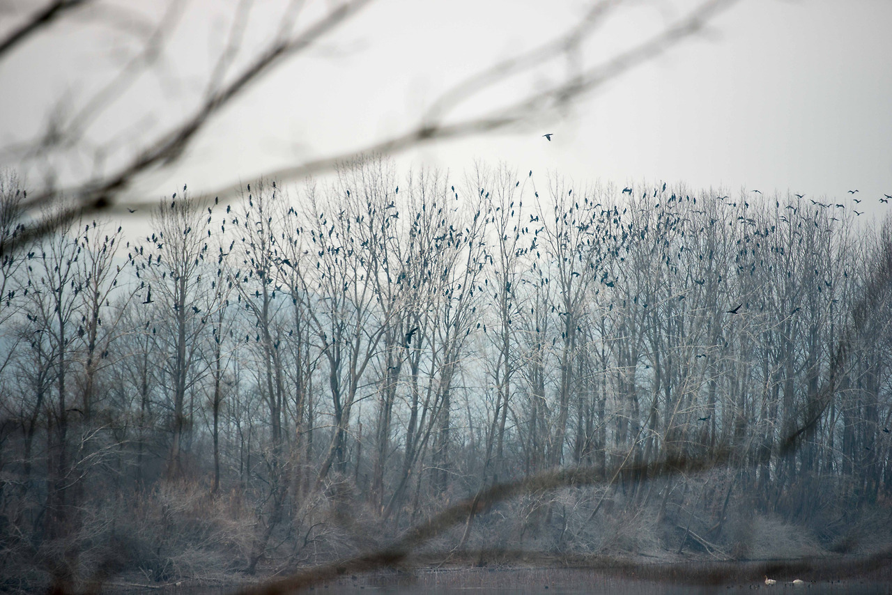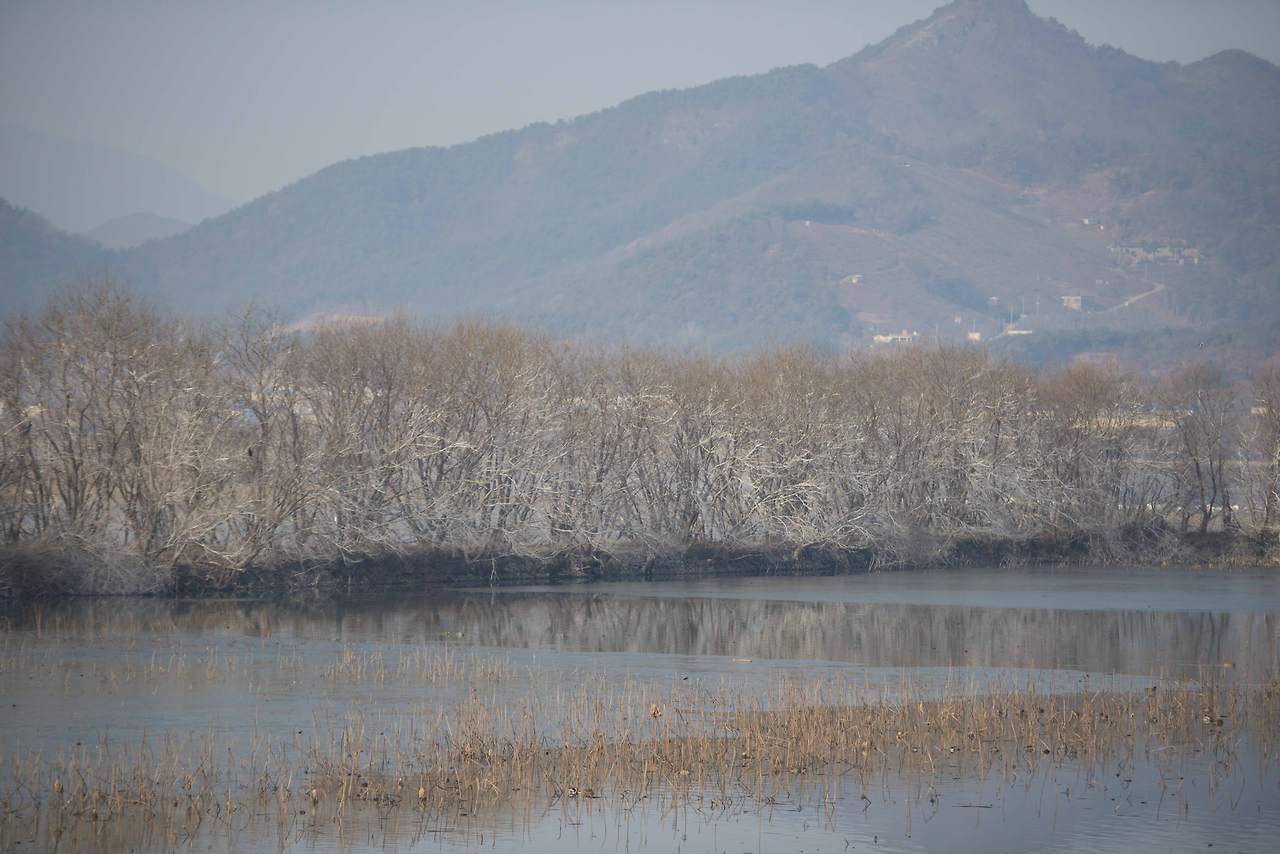 둑 아래로 펼쳐지는 호수는 서울광장의 680배라더니 저수지라고 하기에는 너무 넓다. 잡목 사이로 보이는 넓은 호수에는 더 많은 새들이 헤엄치고 있고 그 옆의 나무 위에 새까맣게 앉아 있는 것들이 전부 새다. 와우~