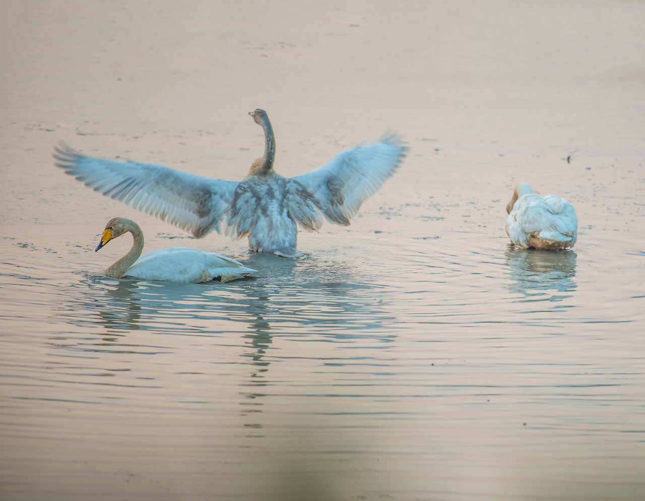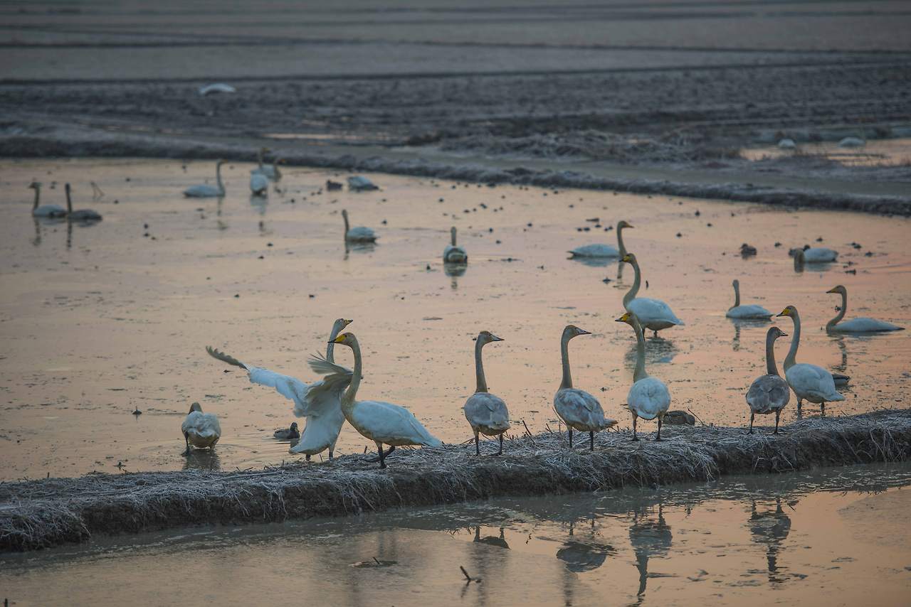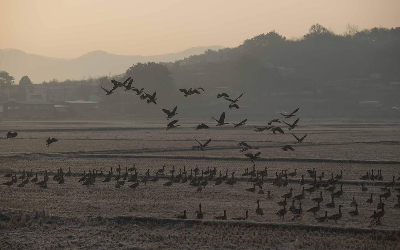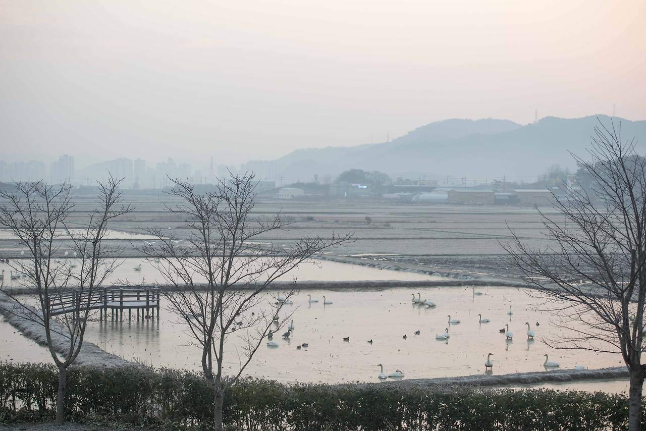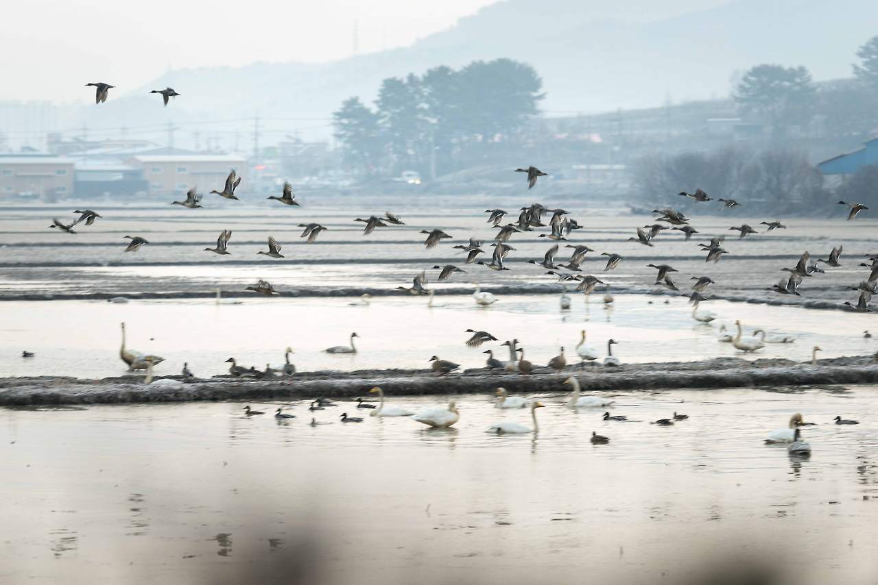 어둠이 채 가시기 전, 논둑에서 들려오는 새들의 지저귐이 대단하다. 새벽부터 뭐라고 저리 떠드는지! 어느 무리들은 싸움인지 장난인지 이리 쫒고 저리 쫒고. 그들의 삶의 현장이 고스란히 보이고 있다. 이름을 알 수 없는 오리 떼, 고니 떼들의 수는 세지 못할 정도로 엄청나다. 작년에 왔을 때는 AI 때문에 경계 벽 앞에서 돌아가야 했건만 올해는 무탈하게 많은 새들을 볼 수 있으니 얼마나 다행인지!