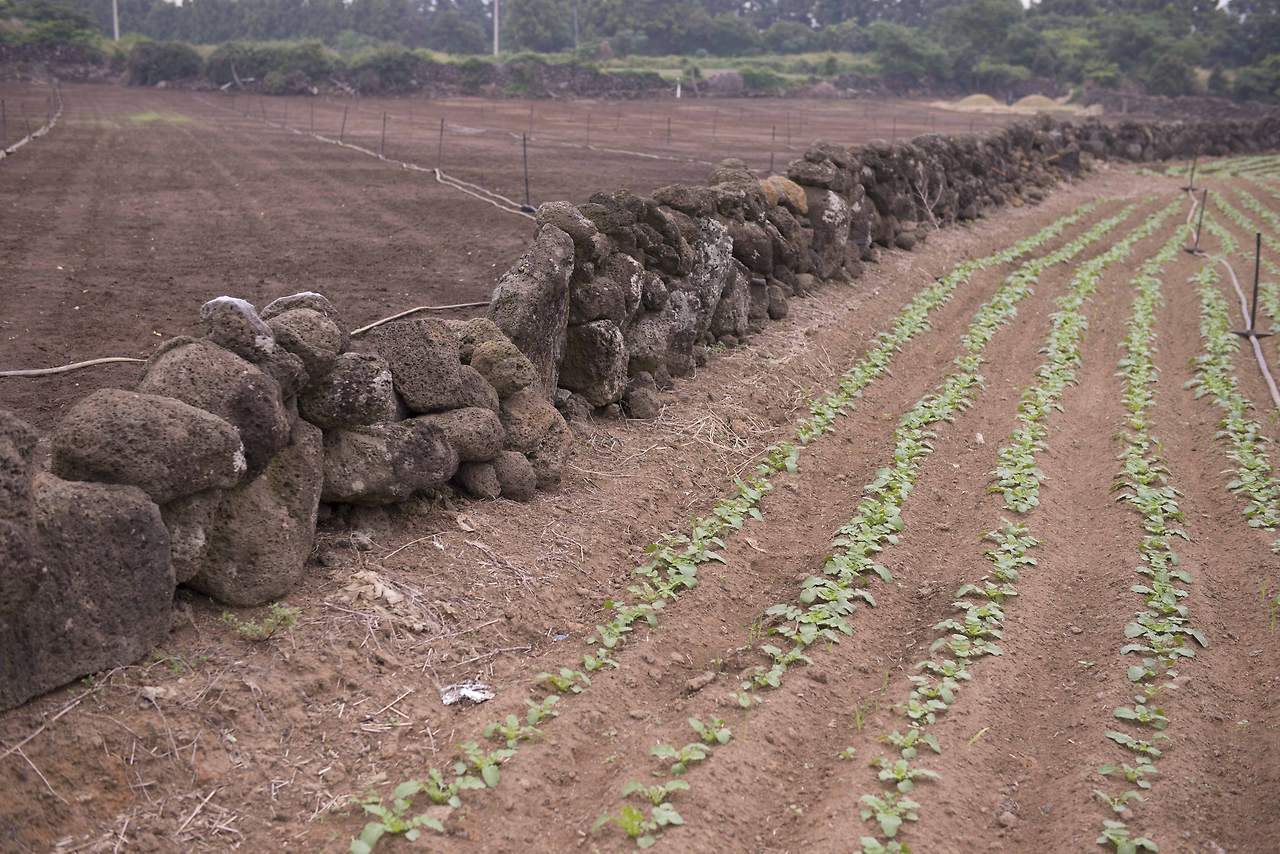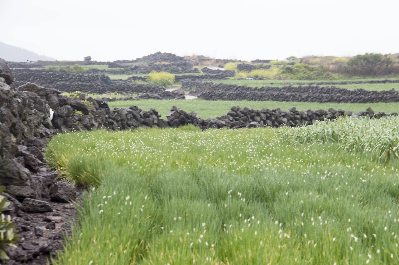 제주도의 분위기가 물씬 풍겨 나는 돌담이 있는 풍경